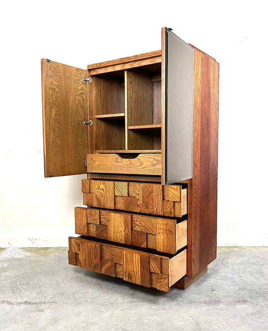 Lane Staccato Oak Brutalist Armoire Mid Century Modern Tall Dresser with Mirror Doors