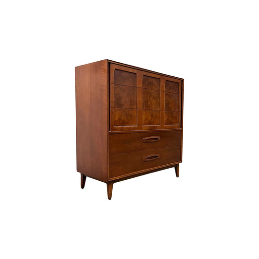 Red Lion Vintage Mid Century Modern Walnut & Burl Highboy Dresser c. 1960s