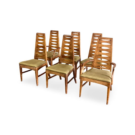 Young Manufacturing Mid Century Modern High Back 7 Slats Set of 6 Cat Eye Dining Chairs c. 1960s