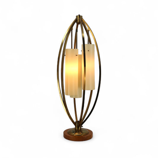 Striking Jet Age Vintage Mid Century Modern Walnut and Brass 3 Glass Shade Table Lamp c. 1960s