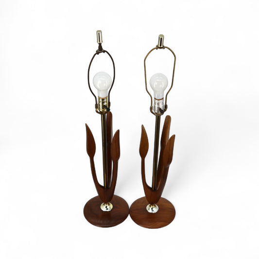 Tulip Petal Sculptural Vintage Mid Century Modern Walnut and Brass Pair of Table Lamps c. 1960s