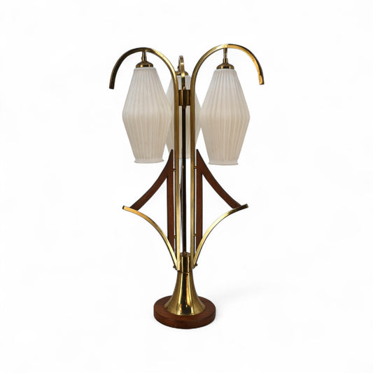 Striking Jet Age Vintage Mid Century Modern Walnut and Brass 3 Glass Shade Table Lamp c. 1960s