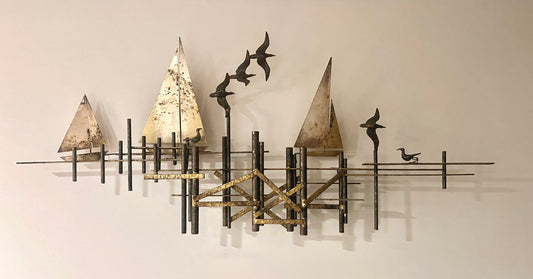 Curtis Jere Brutalist Seagulls and Sailboats at the Dock Metal Wall Sculpture c. 1972