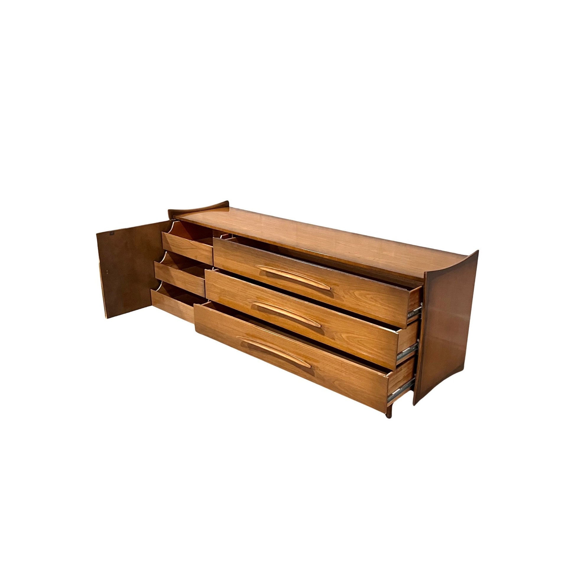 Transform your bedroom into a retro haven with this vintage 1960s lowboy dresser. Crafted in the iconic mid century modern style, it boasts unique atomic curves on the sculpted wood panels. With 6 pull-out drawers, this one-of-a-kind piece offers ample storage space for all your belongings. The sculpted wood drawer pulls add a touch of vintage charm. Donโt miss out on this great design aesthetic that perfectly balances minimalism and attitude.