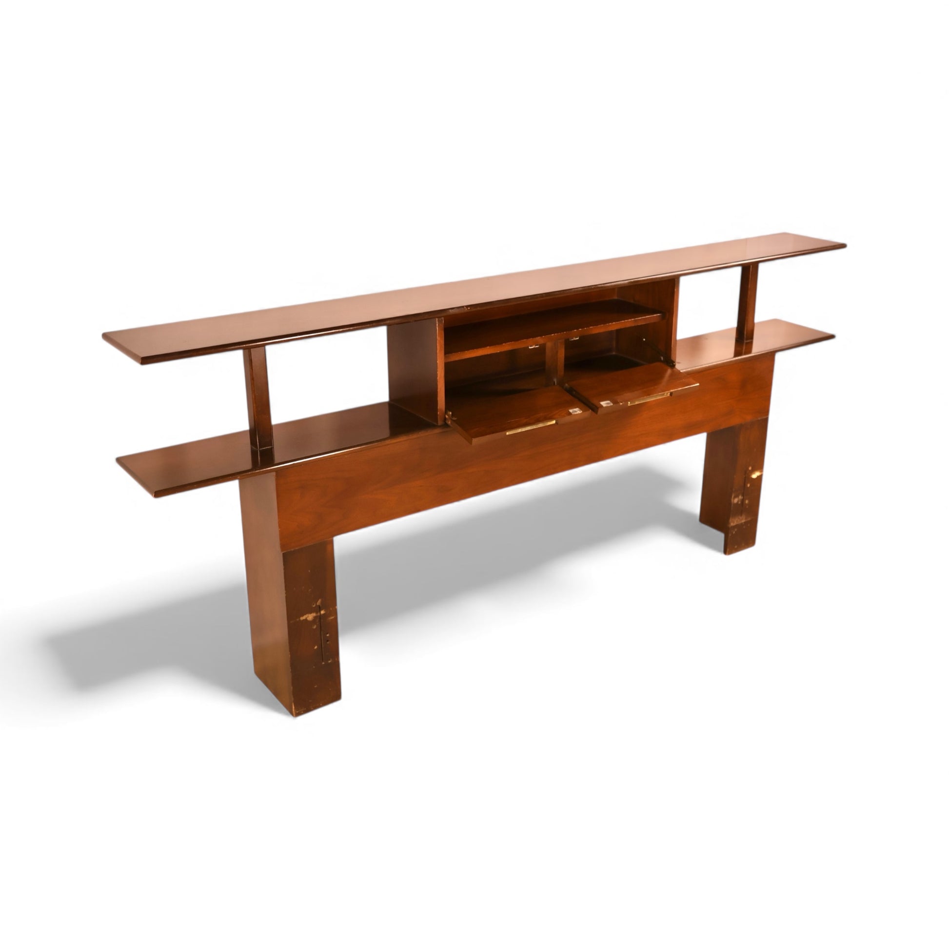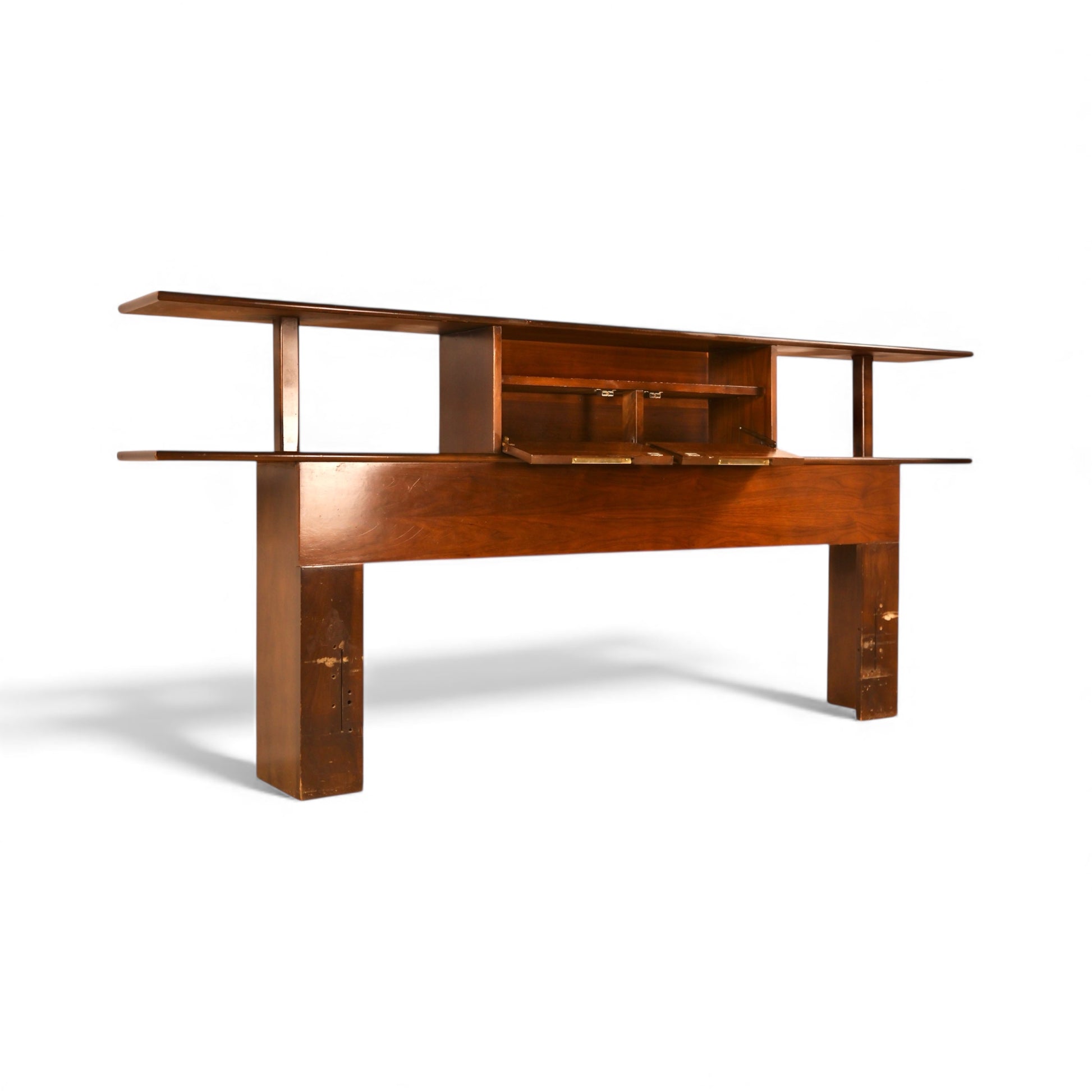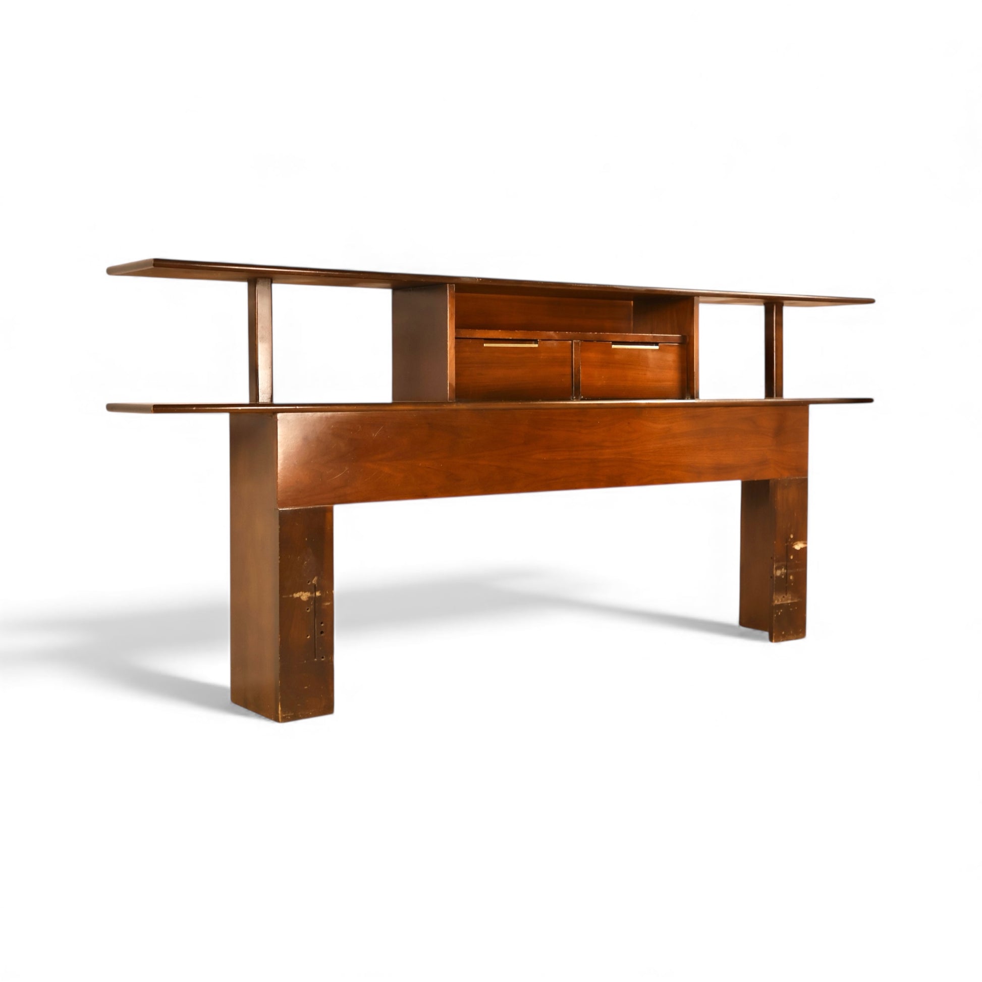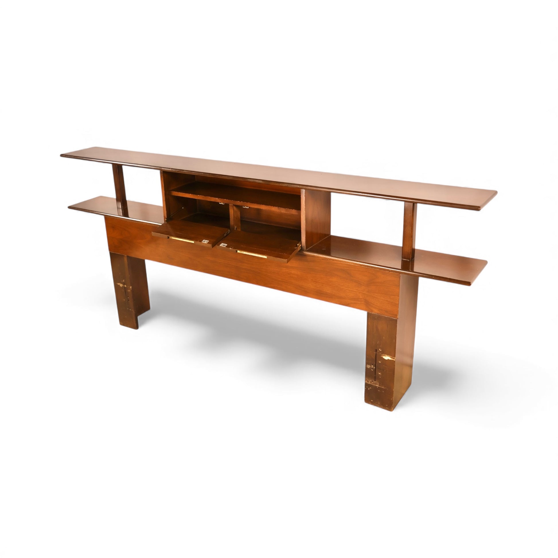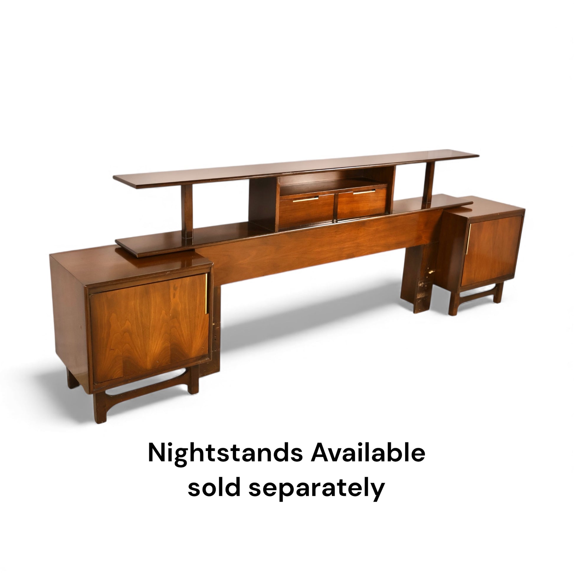 This 1960s Cavalier queen headboard brings a warm, architectural presence to the bedroom with its layered walnut silhouette and functional center storage. Designed with extended platform wings on each side, it was made to accommodate nightstands neatly beneath the overhang, creating a cohesive built-in look. The walnut grain adds richness and depth, while the central cabinet offers discreet storage behind drop-front doors—ideal for books, small electronics, or bedtime essentials.