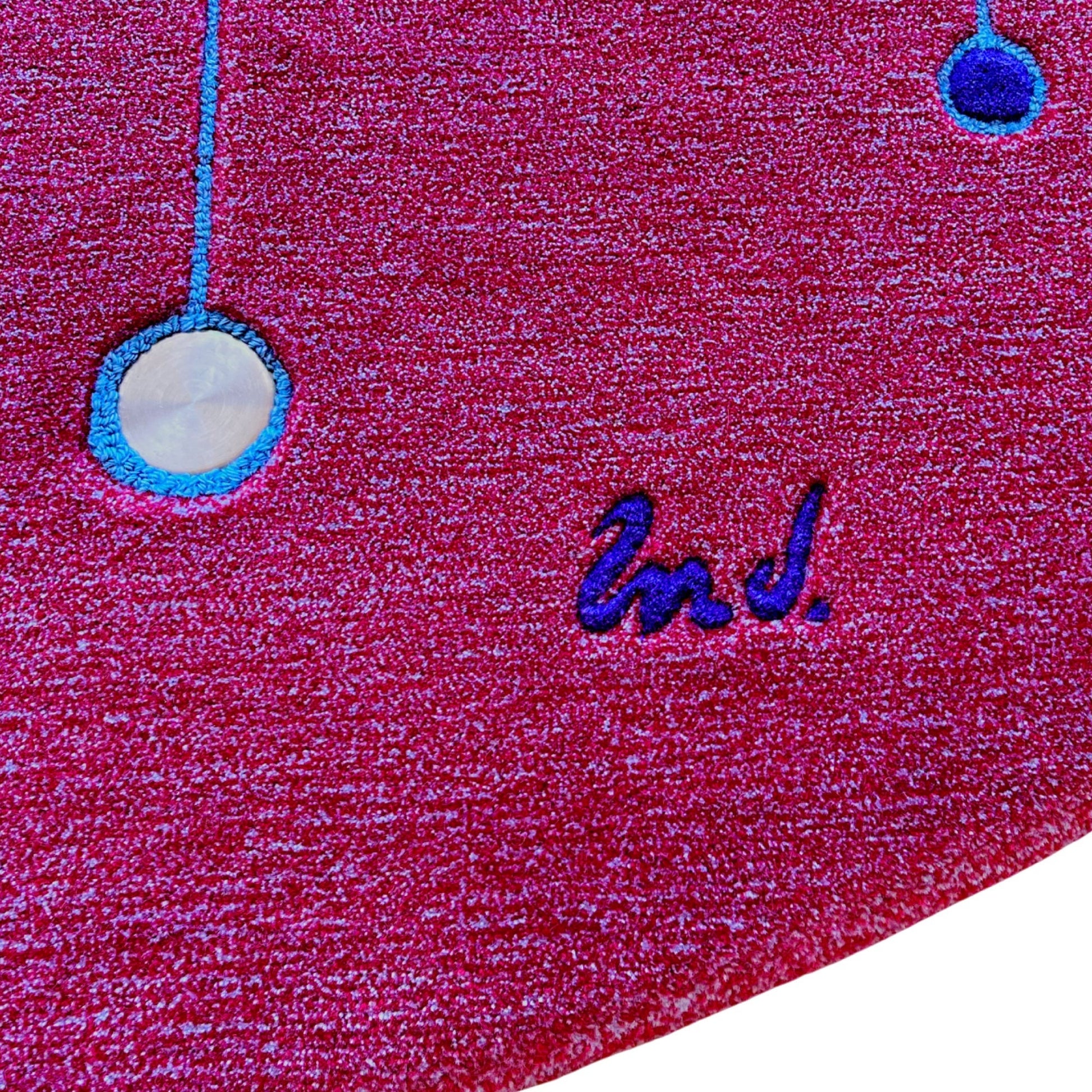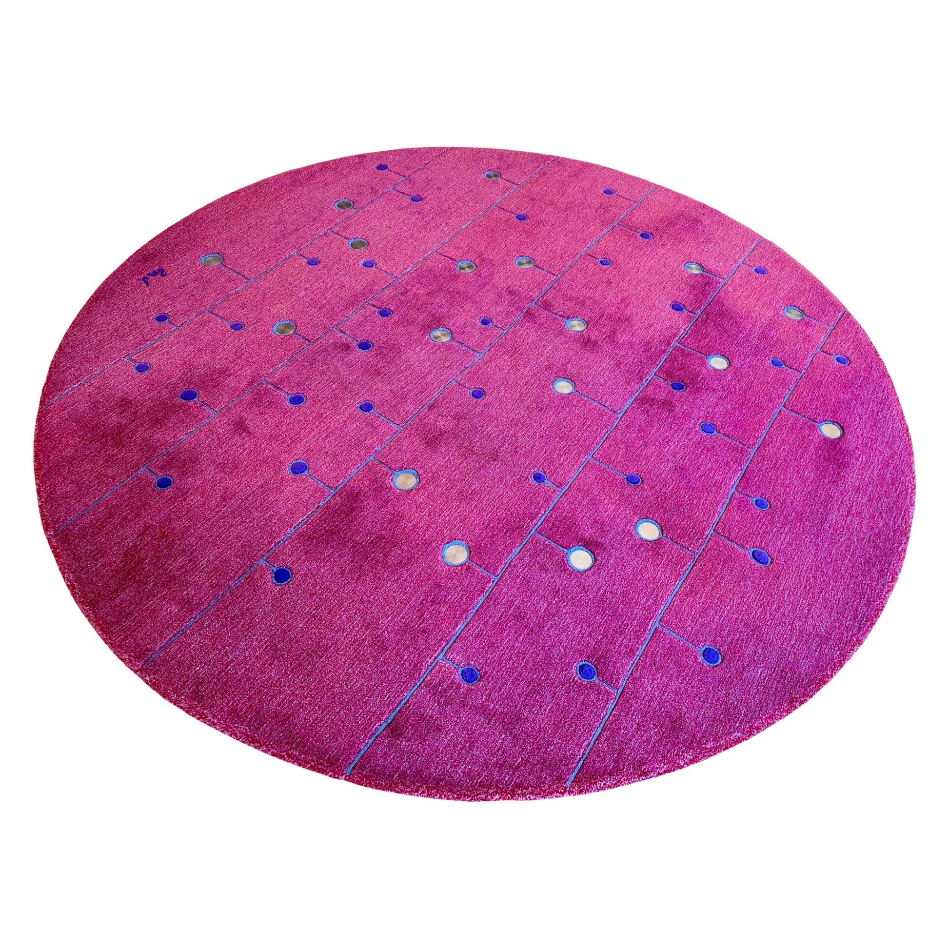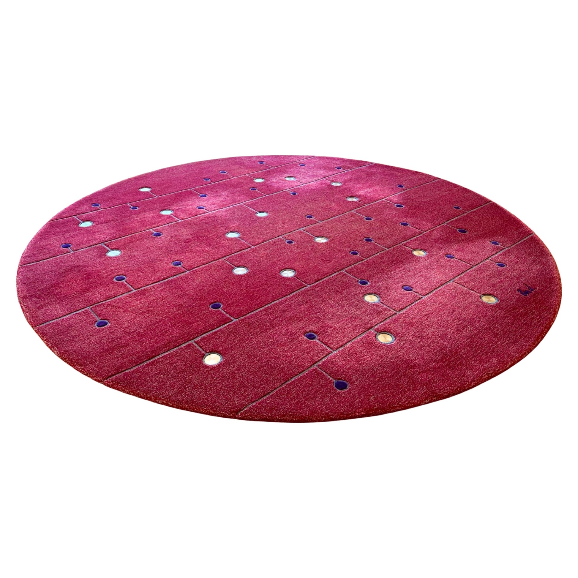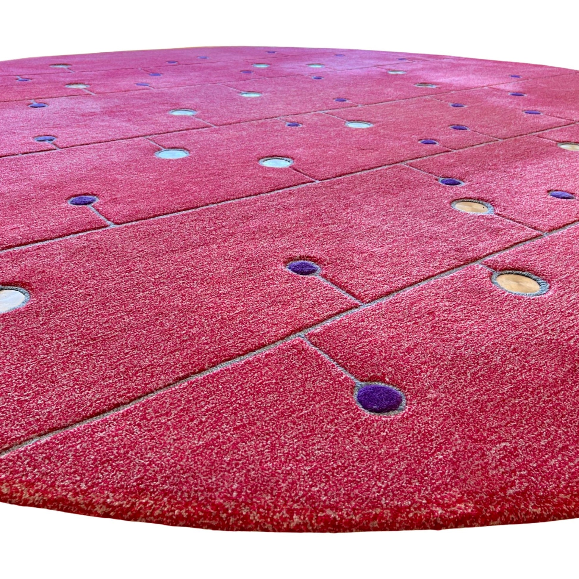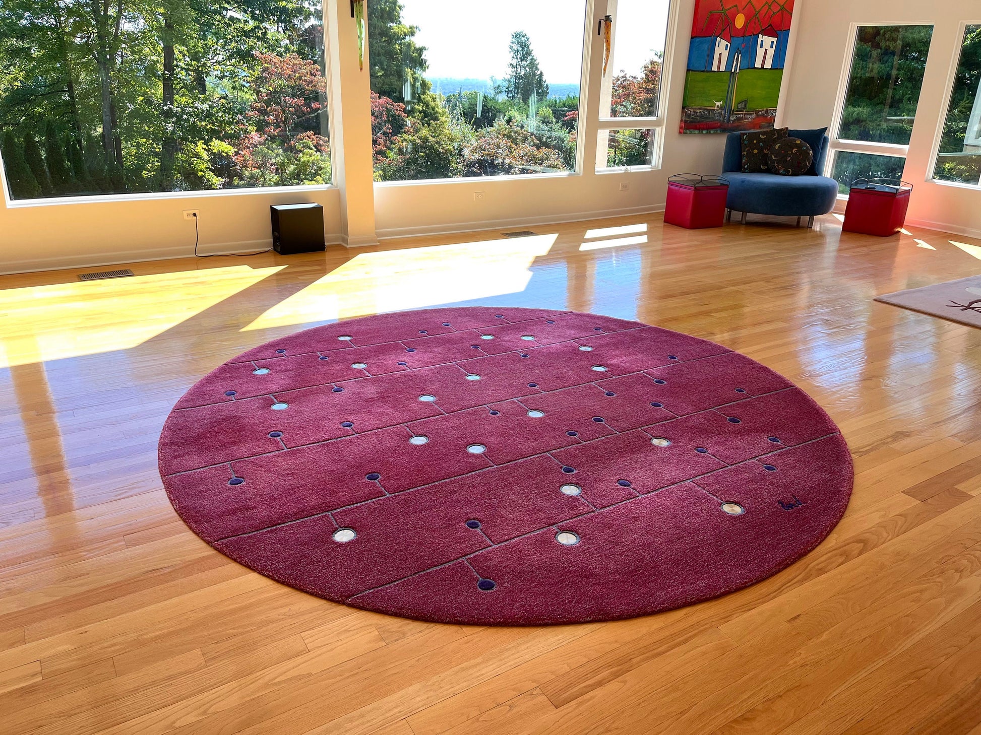 Dellarobia DR Studio Collection “Manhattan” custom colored and custom sized, round 10’ x 10’ Area Rug. Modern abstract rug is hand tufted in 100% New Zealand pure wool. Cut pile yarn tweeded in combination of Dove Grey and Madison Grey and loop Piled Lipstick Red. Features a beautiful pattern of purple and Brushed Stainless Steel Circle Inserts. Signature of designer, Marina Strumphler, displayed on rug. Serial Number on label and original design paperwork pictured. The “Manhattan” line is no longer in production and you will not find this one of a kind rug in this excellent condition again.