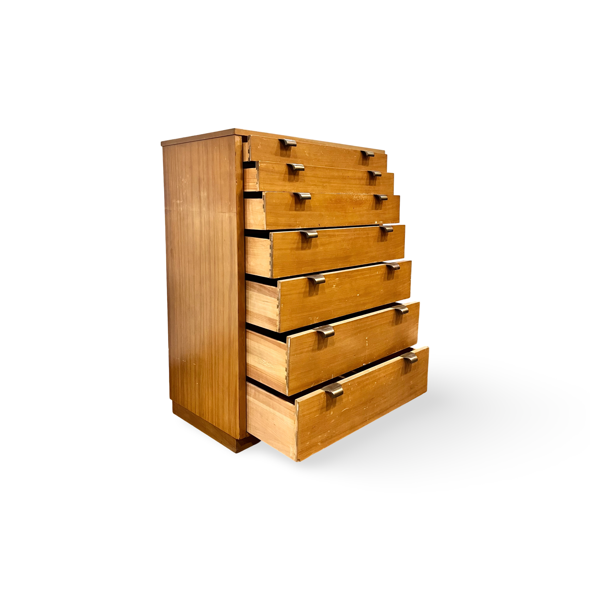 From the renowned Drexel Precedent line, designed by Edward Wormley in 1949, comes this exquisite mid-century modern seven-drawer dresser. Crafted as a part of Drexel Furniture's introduction to modern design, Wormley's pieces were regularly featured in MoMa’s Good Design exhibits during the 1950s. This dresser showcases an impeccable linear silhouette balanced by its smooth, flat surfaces and sharp, clean edges.