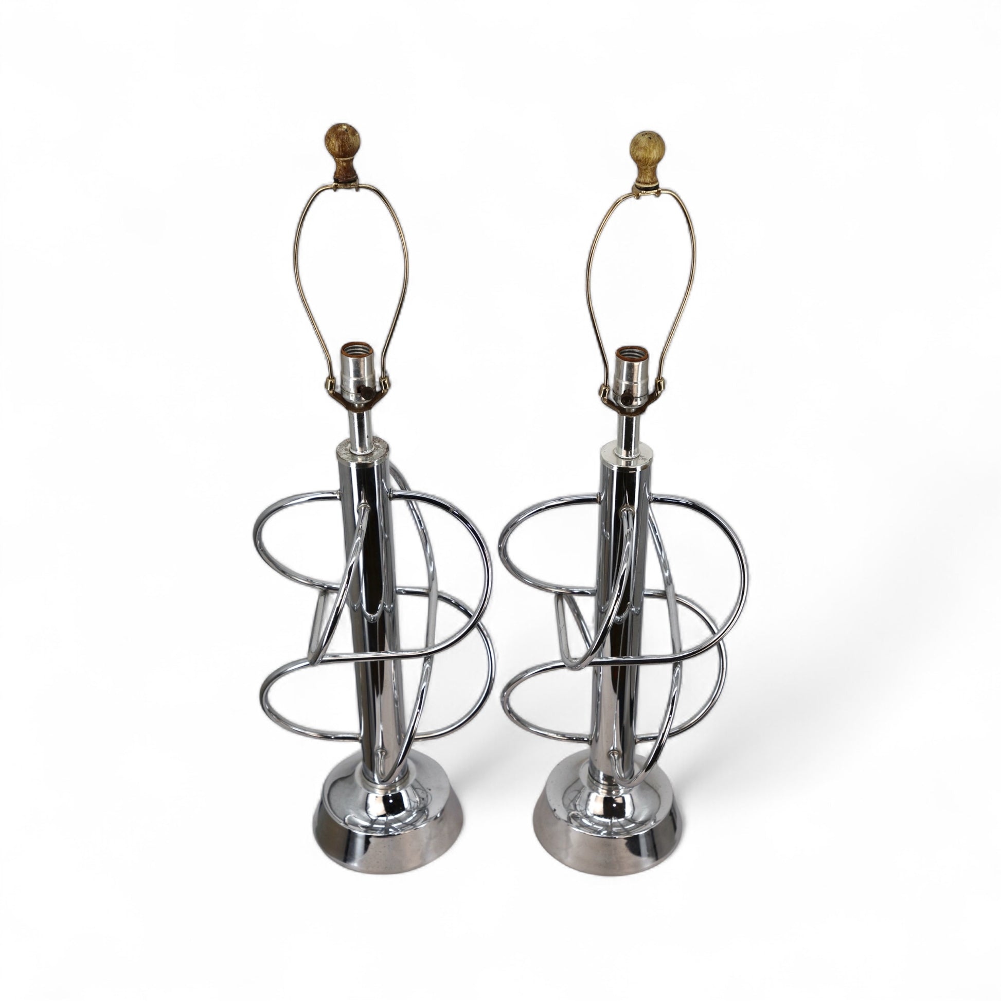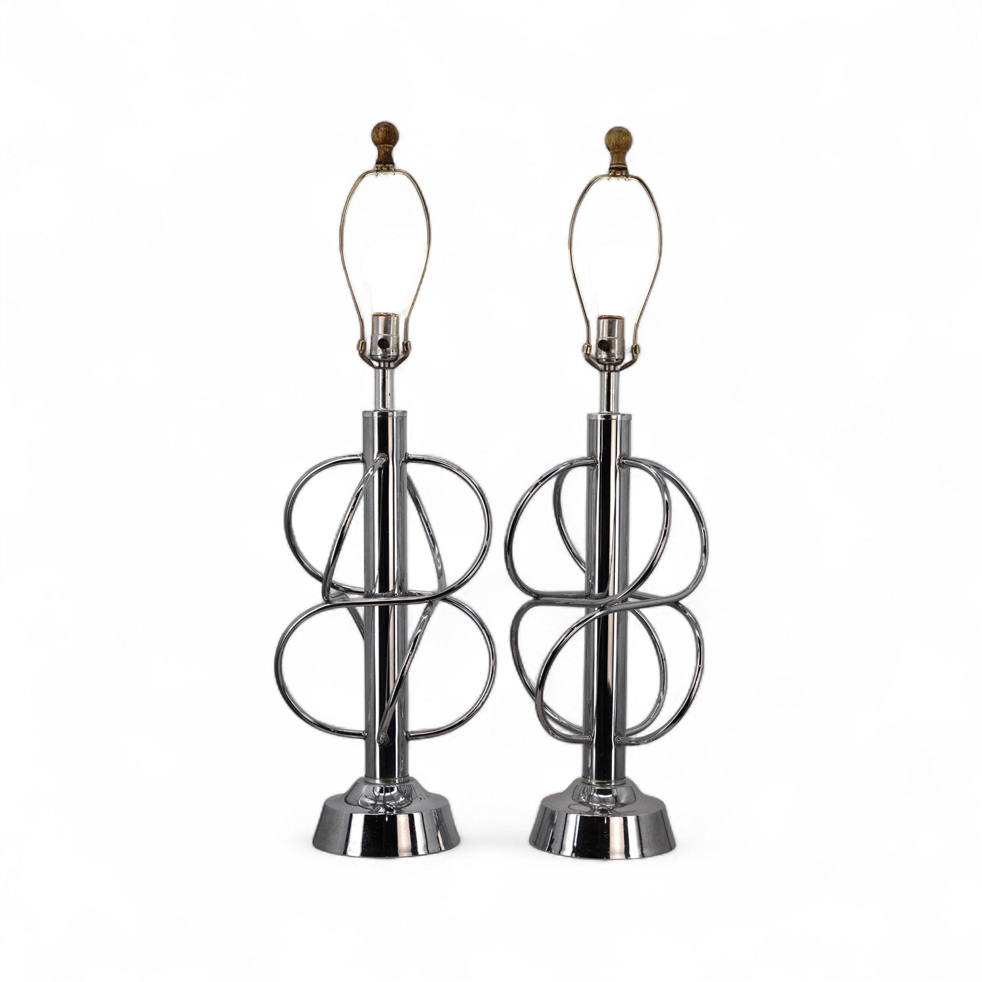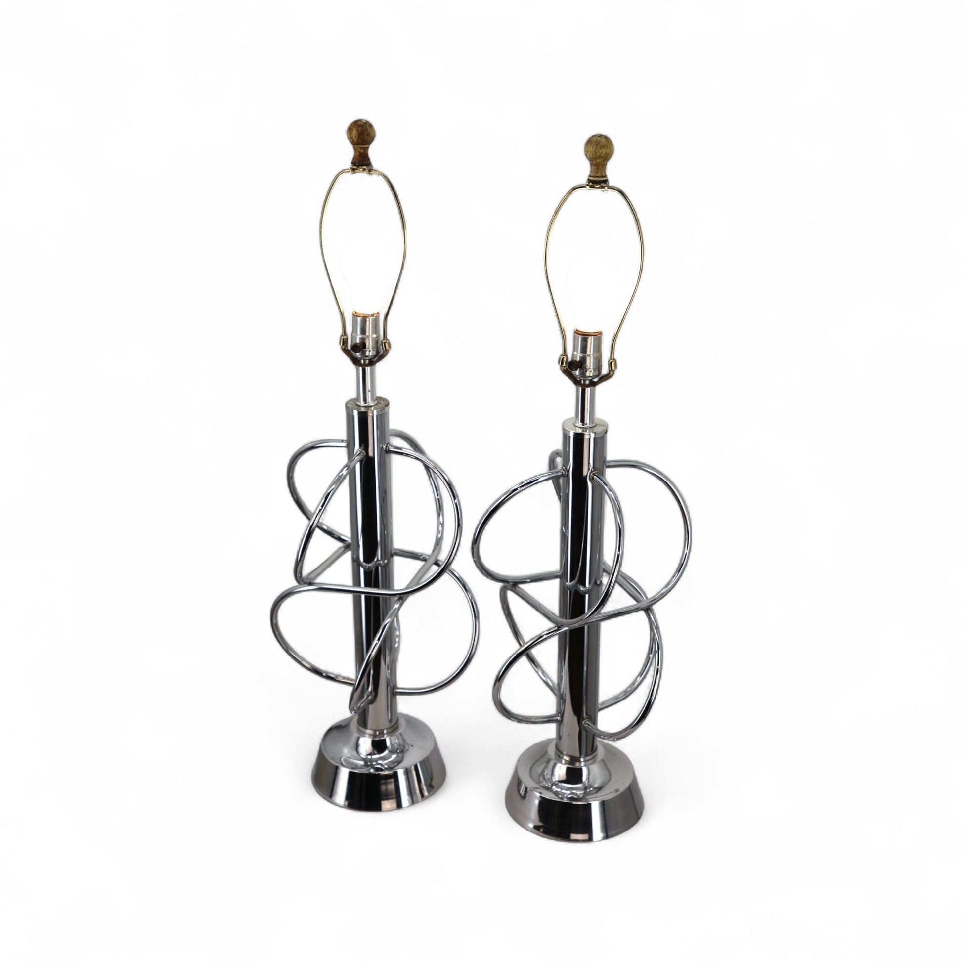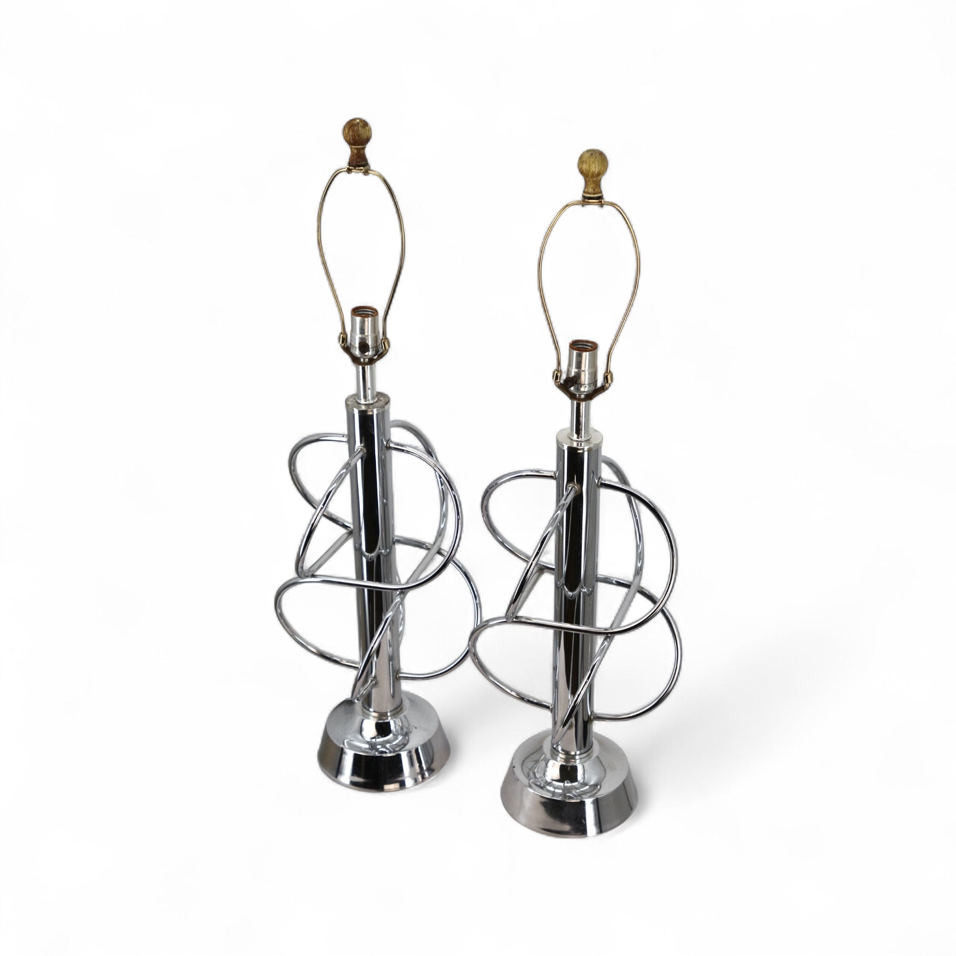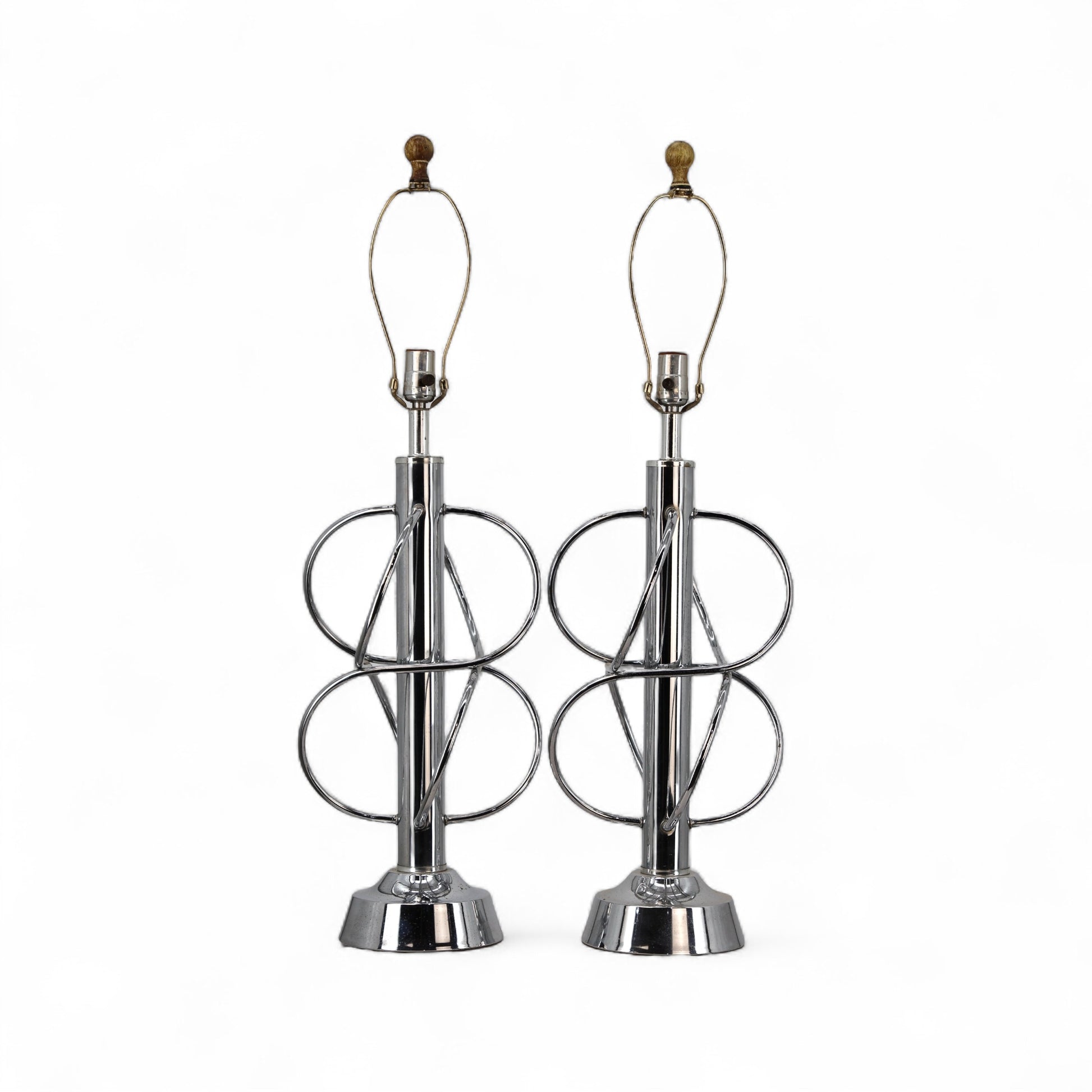 A bold statement in atomic-era design, this pair of vintage chrome table lamps channels the energy and optimism of mid-century modernism. Sculptural and geometric, each lamp features an intersecting orbital form that wraps around a central column like stylized atomic rings in motion. The highly reflective chrome finish accentuates the three-dimensional silhouette, creating visual movement from every angle.