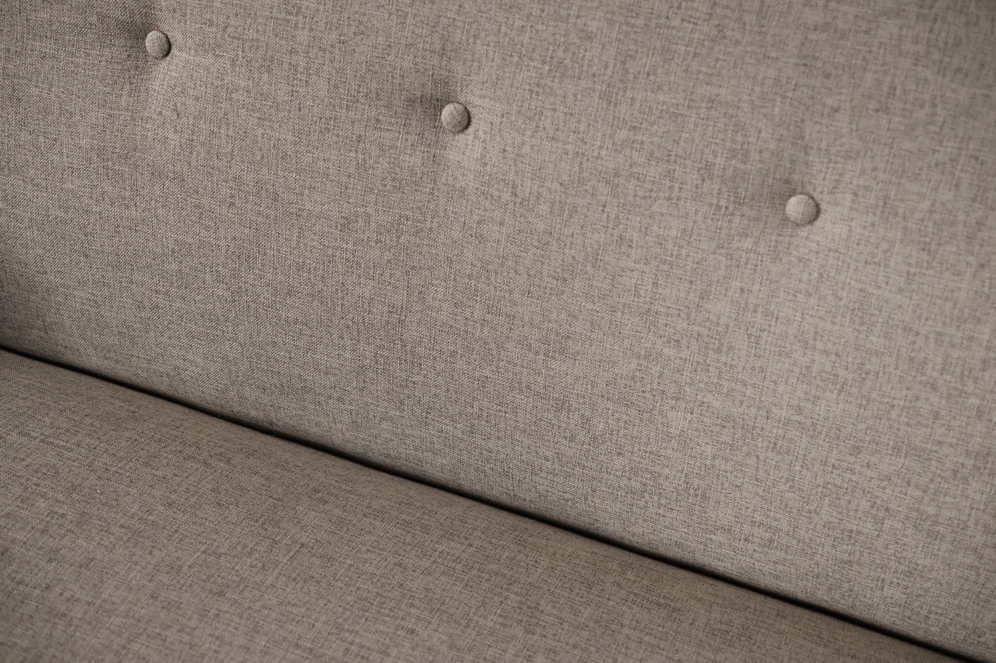 Rare early example from the renowned Jens Risom — this Model 37 sofa dates to the 1940s and exemplifies the designer's hallmark Scandinavian-meets-American modernist sensibility. The sofa features a gently reclined backrest accented by a row of five button-tufted details along the upper back, low sculpted paddle arms, and a single continuous bench seat. The frame is crafted in dark walnut with characteristically angular, splayed legs joined by a stretcher rail along the base. Upholstered in a heathered oatmeal woven wool fabric in warm beige tones.