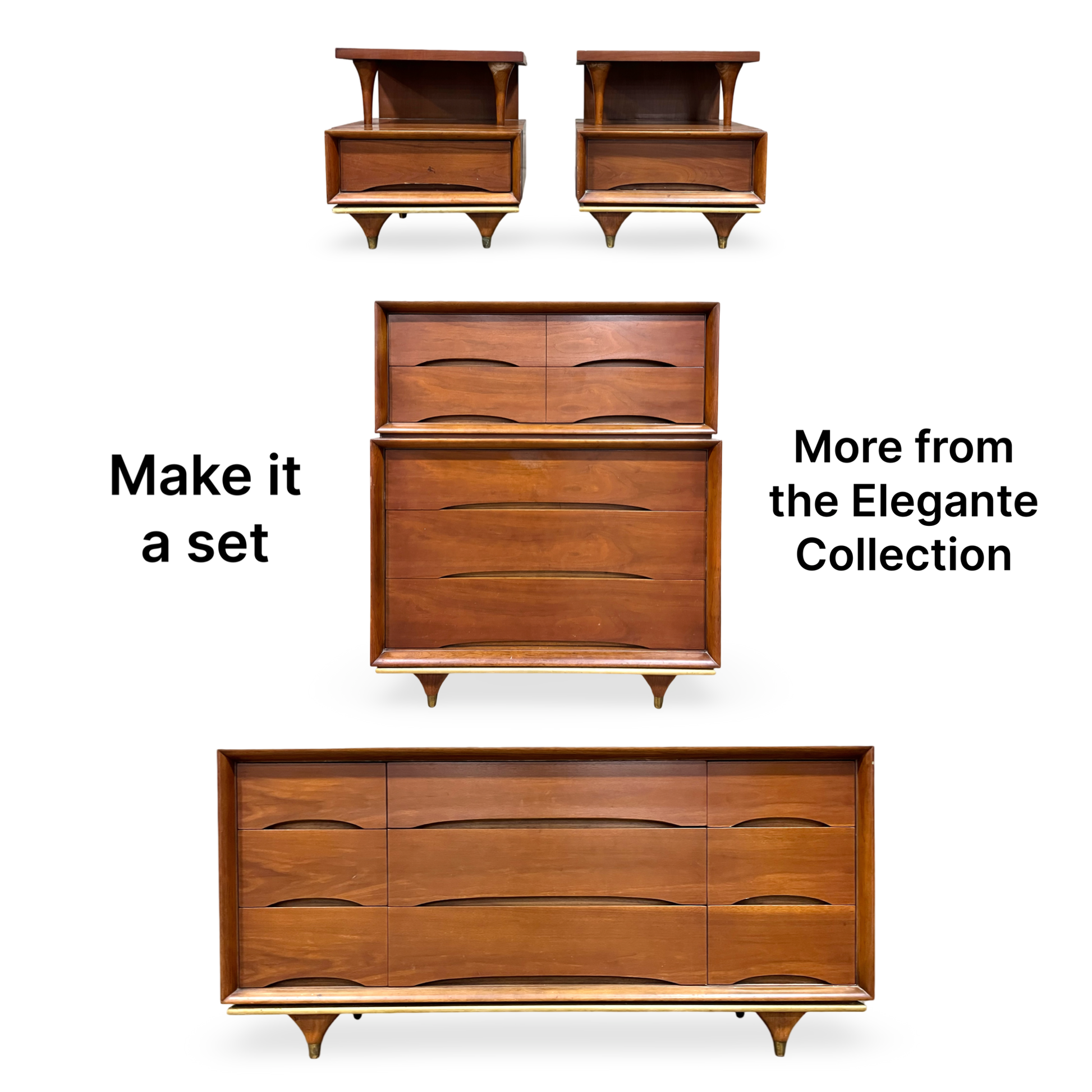 Capture the quintessence of mid-century modern design with these vintage Kent Coffey "Elegante" nightstands. Crafted in the 1960s, these nightstands exemplify the period's fascination with streamlined forms and functional aesthetics. Each nightstand features a walnut finish that enhances the natural grain, presenting a warm, inviting tone that enriches any bedroom decor. The design includes a single spacious drawer and an open shelf space above, providing ample storage and display options within a compact footprint.