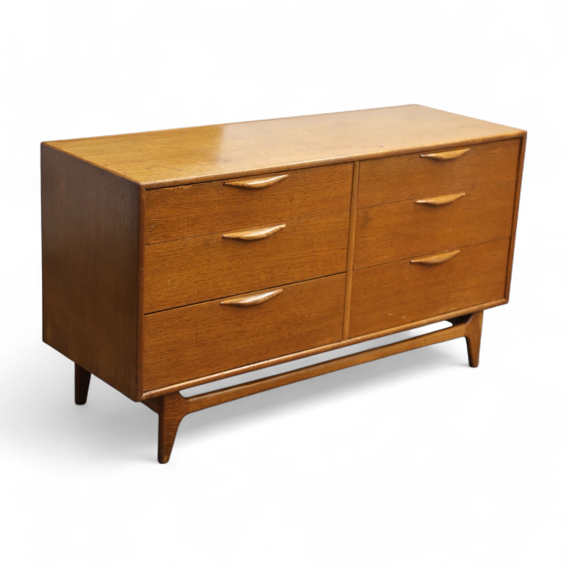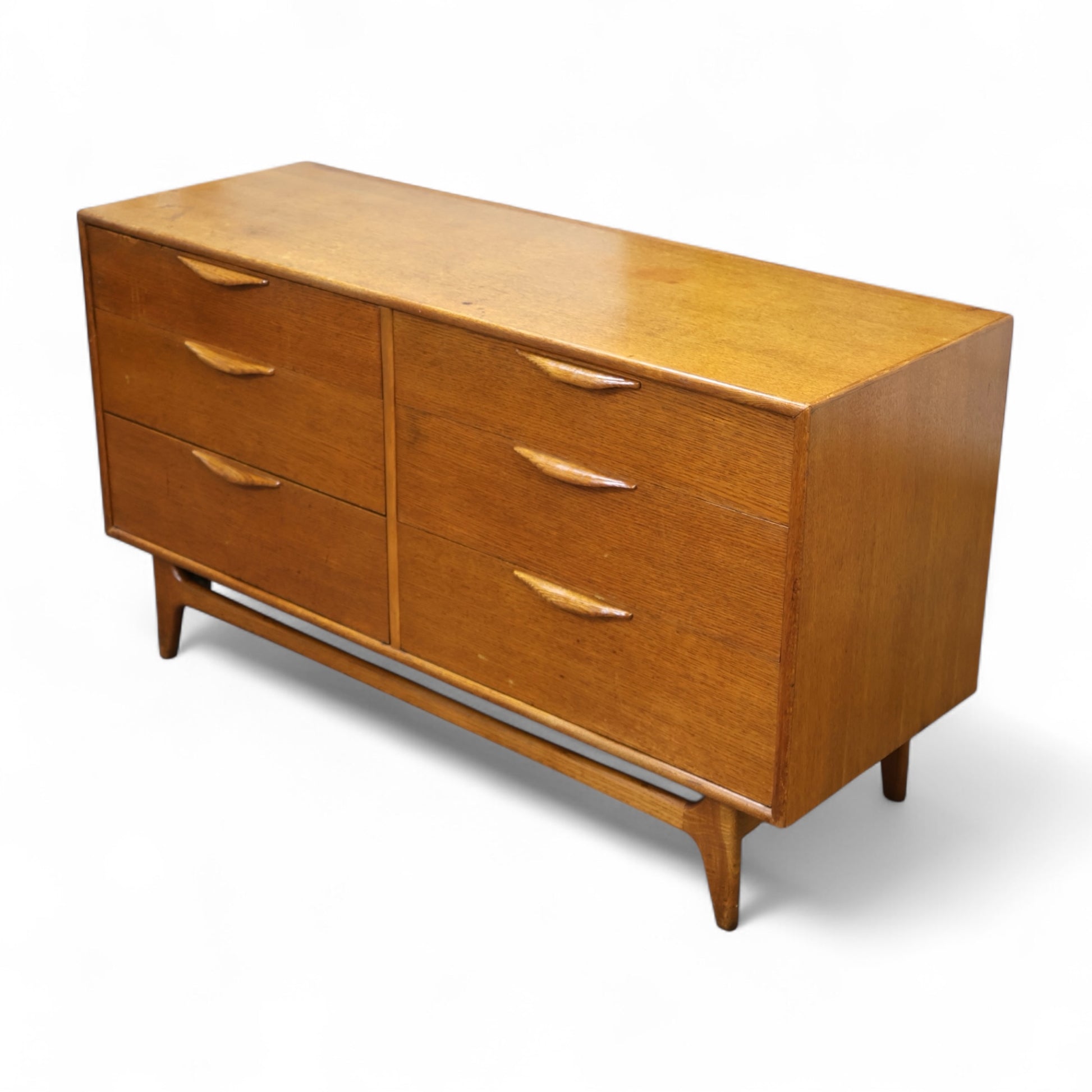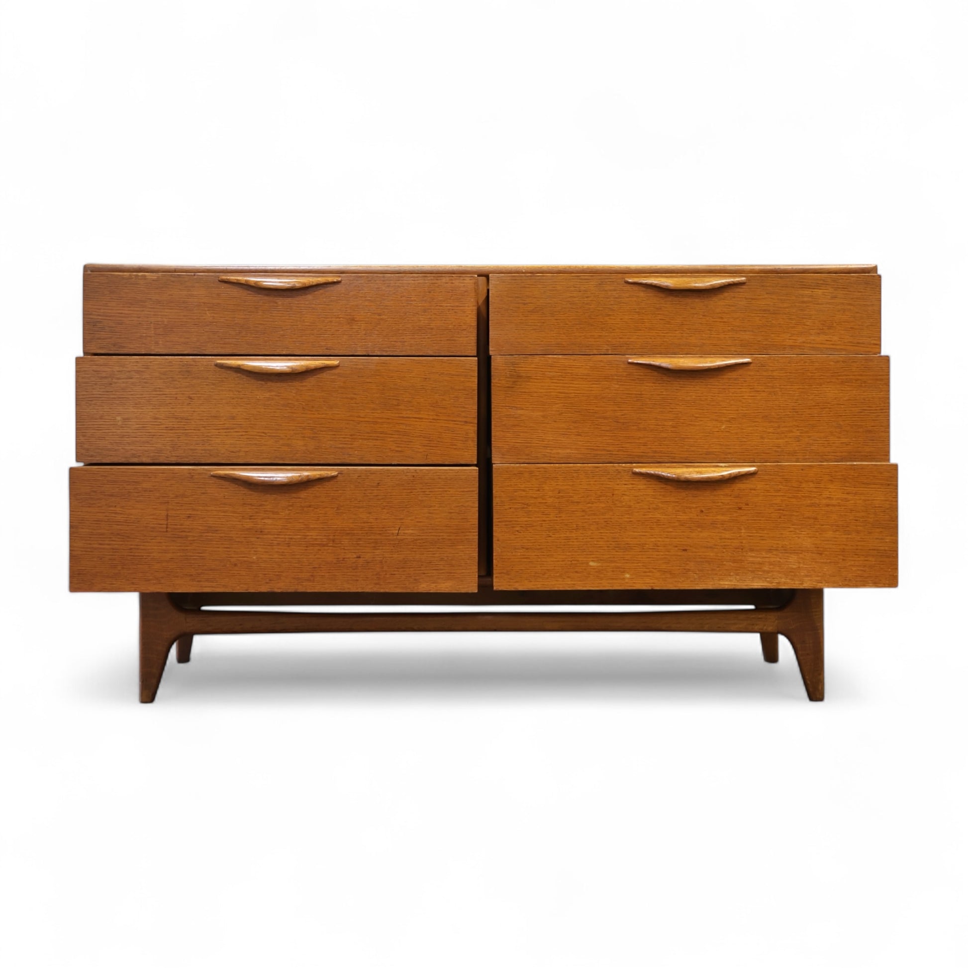 This 1960s lowboy dresser from Lane’s Perception collection exemplifies the clean lines and sculptural details that define American mid-century modern design. Featuring six drawers arranged in a symmetrical layout, the dresser is supported by tapered legs and a stretcher base that adds lightness to the form. The integrated drawer pulls, carved in solid wood, emphasize both craftsmanship and utility with their organic curves and seamless integration.