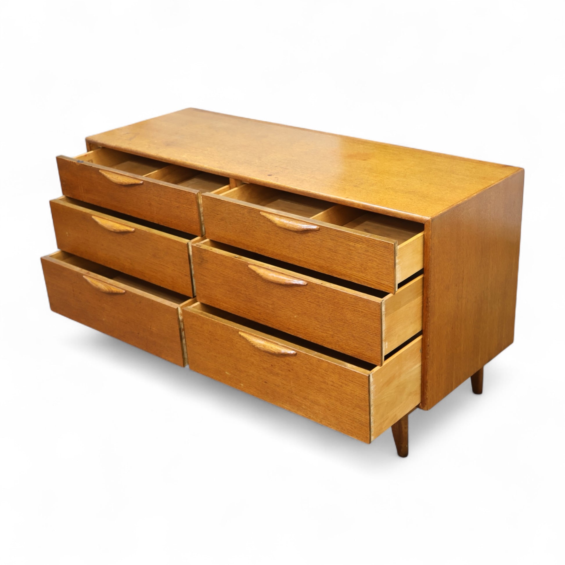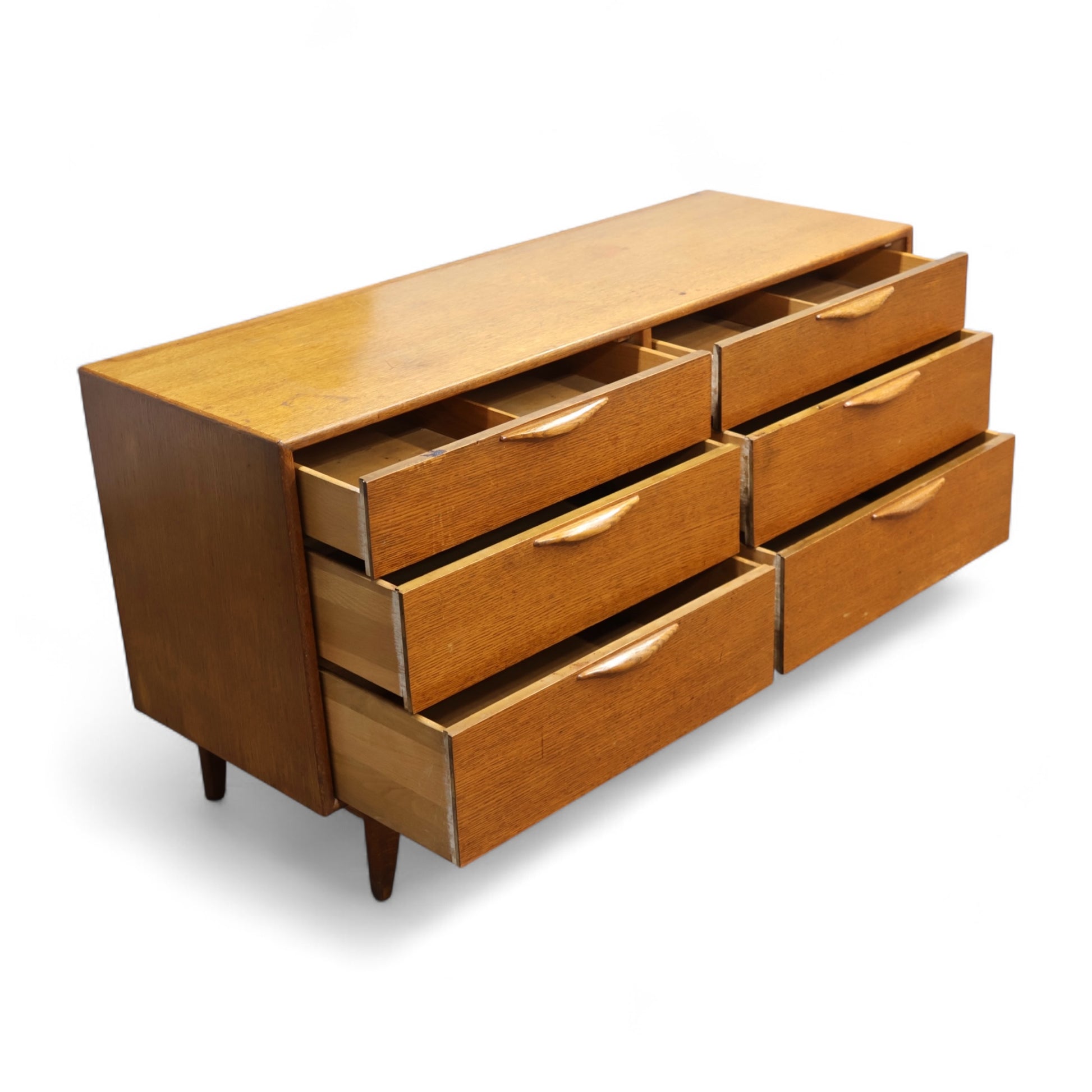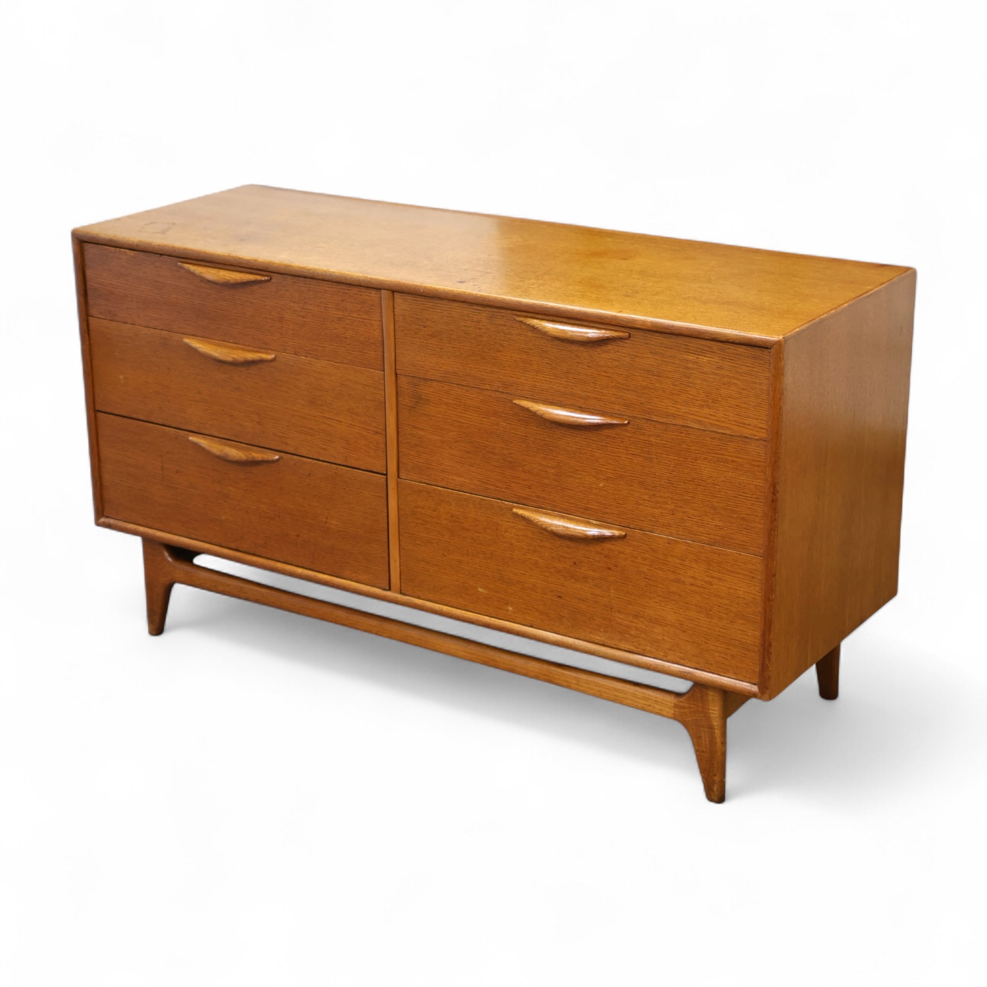 This 1960s lowboy dresser from Lane’s Perception collection exemplifies the clean lines and sculptural details that define American mid-century modern design. Featuring six drawers arranged in a symmetrical layout, the dresser is supported by tapered legs and a stretcher base that adds lightness to the form. The integrated drawer pulls, carved in solid wood, emphasize both craftsmanship and utility with their organic curves and seamless integration.