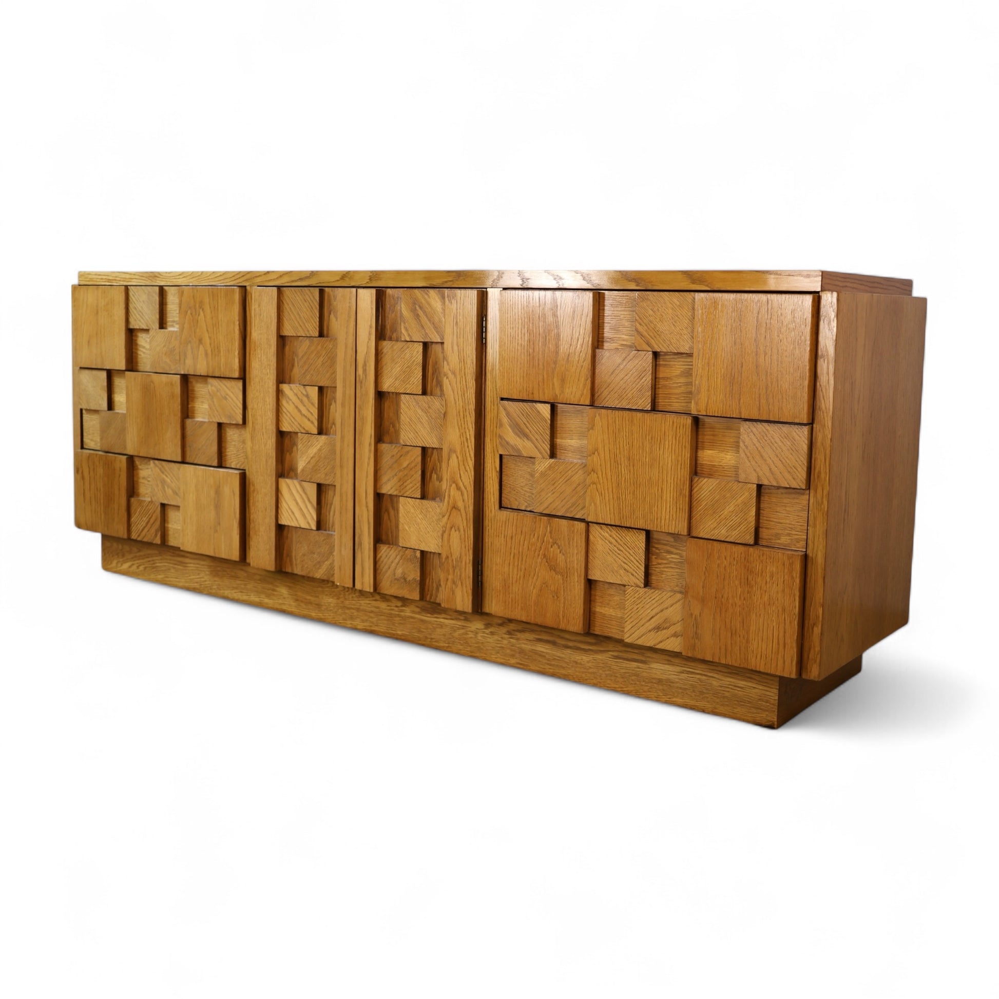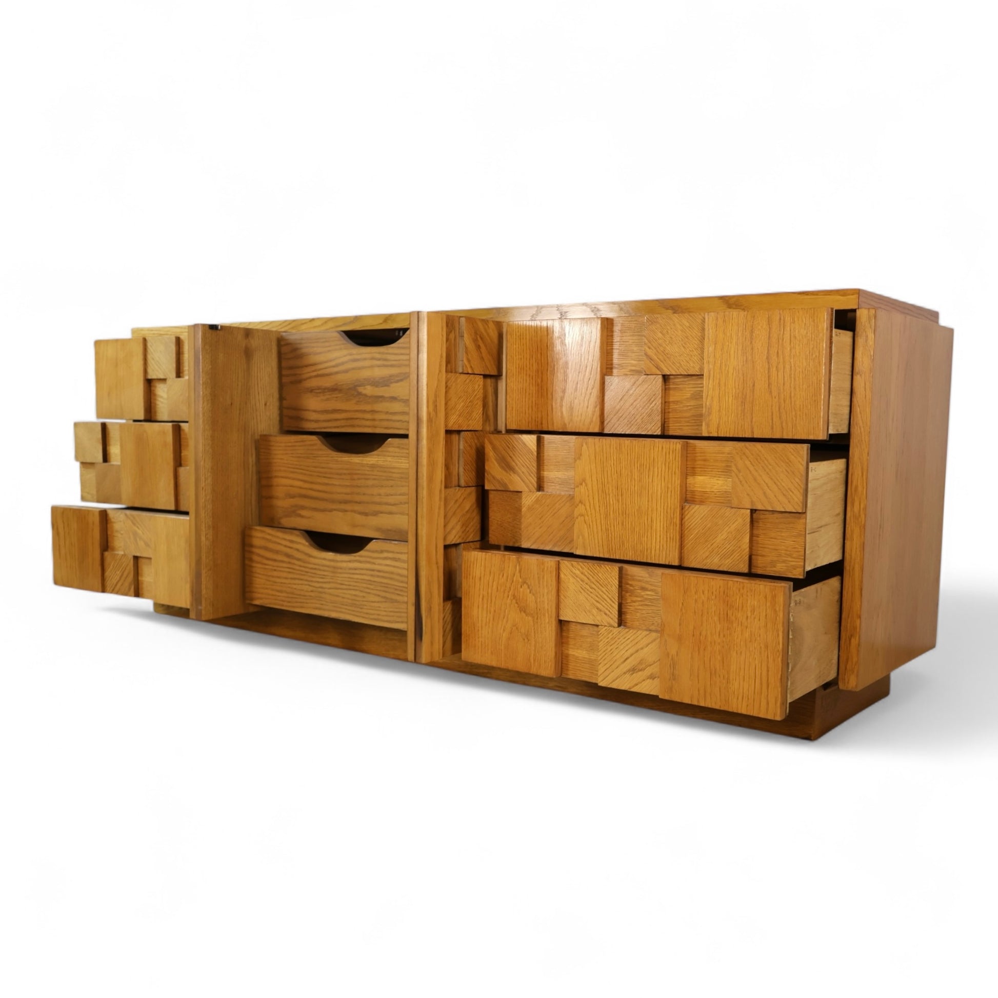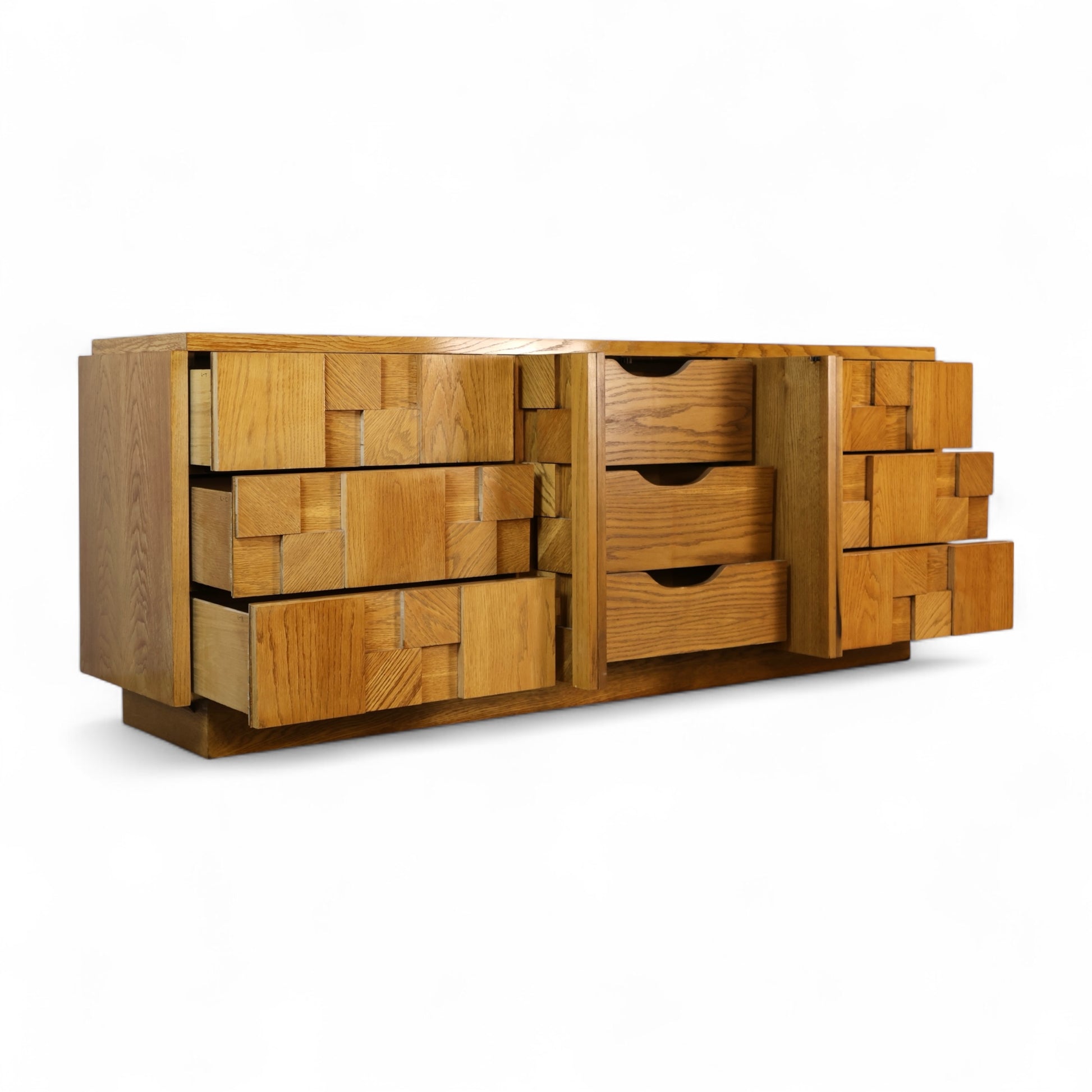 This 1970s Lane Staccato lowboy dresser showcases one of the most iconic Brutalist patterns of the era. Crafted from white oak, the bold three-dimensional block motif across the drawer fronts creates a sculptural façade that feels both architectural and rhythmic. The clean-lined profile and recessed plinth base ground the geometric play, offering a perfect balance between decorative impact and functional design.