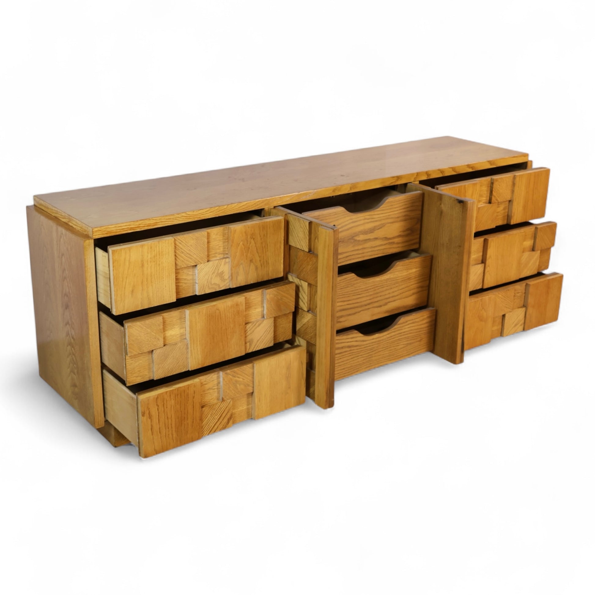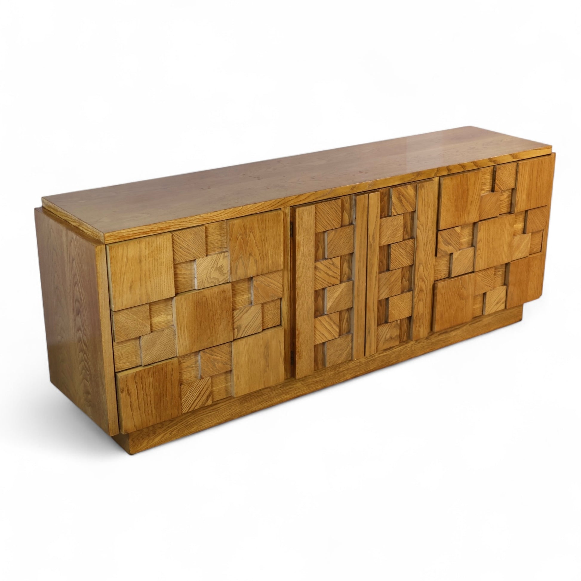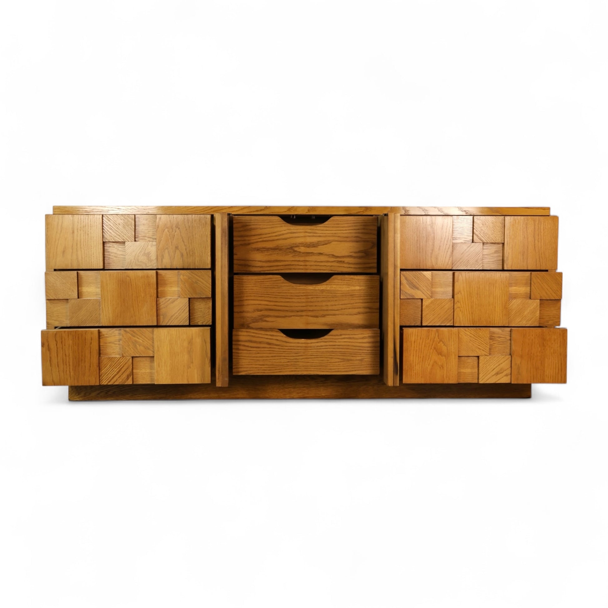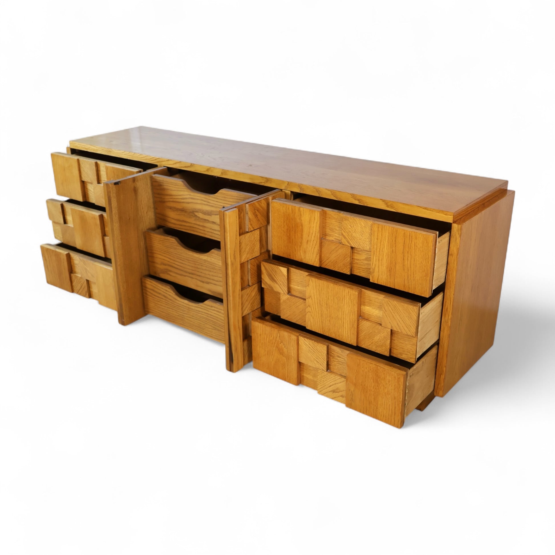 This 1970s Lane Staccato lowboy dresser showcases one of the most iconic Brutalist patterns of the era. Crafted from white oak, the bold three-dimensional block motif across the drawer fronts creates a sculptural façade that feels both architectural and rhythmic. The clean-lined profile and recessed plinth base ground the geometric play, offering a perfect balance between decorative impact and functional design.