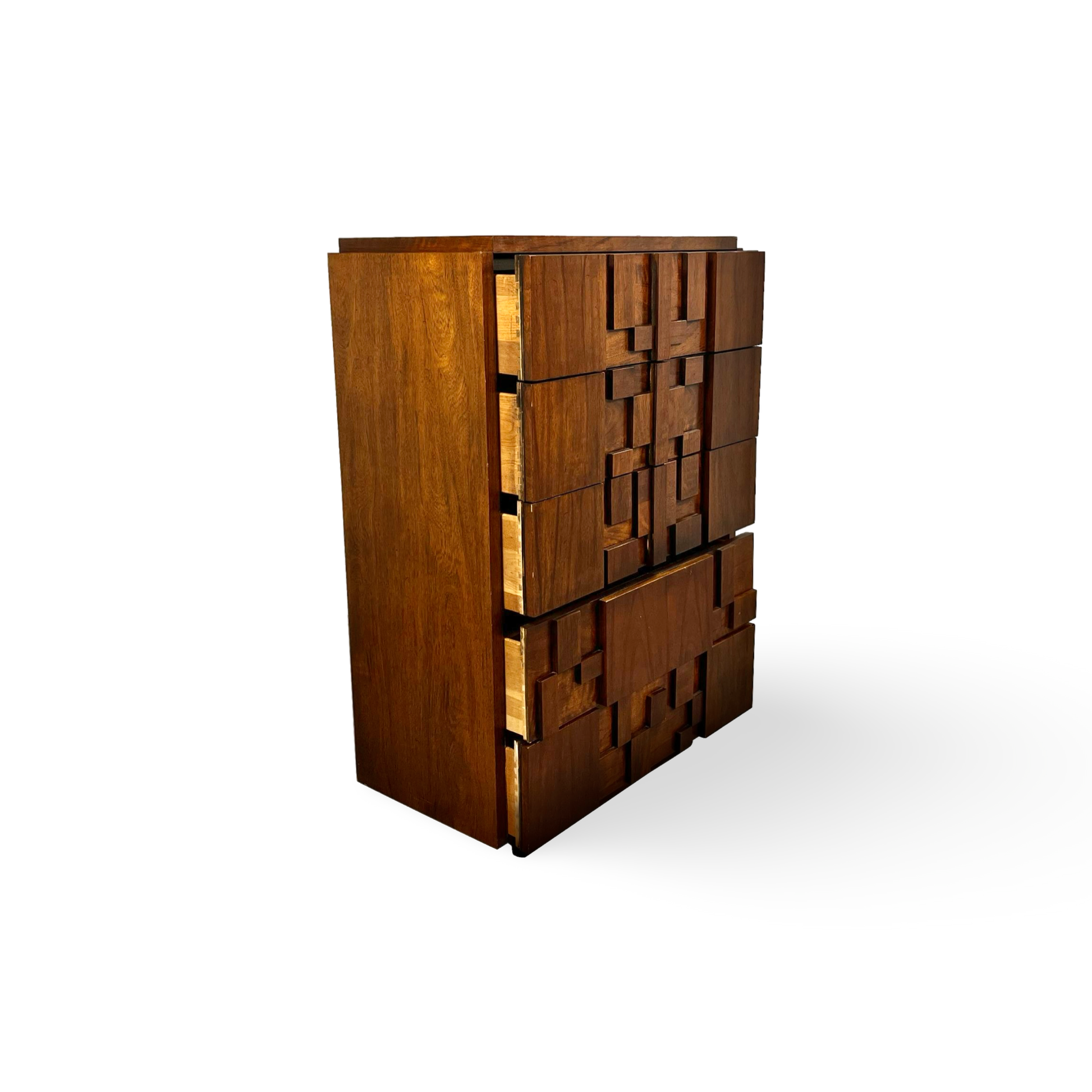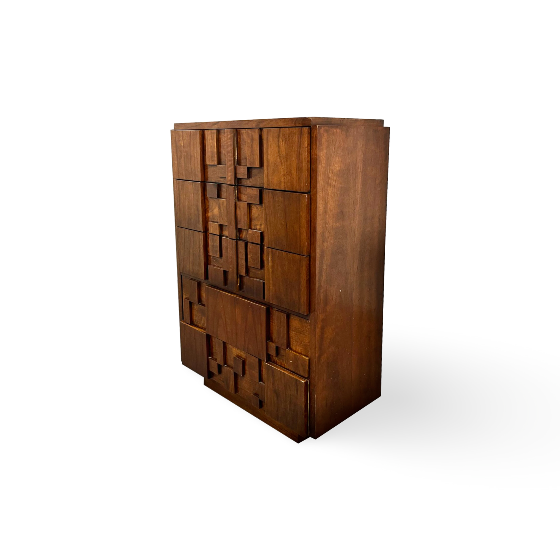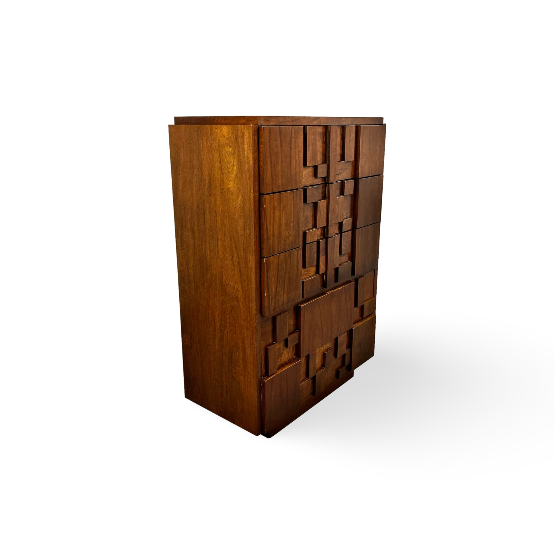 This striking Lane Staccato highboy dresser is a quintessential example of the Brutalist style that characterized much of mid-century modern design during the 1970s. Crafted from robust, richly hued wood, this dresser features a distinctive, textural facade with deeply recessed, abstract wood blocks that create a dramatic visual impact.
