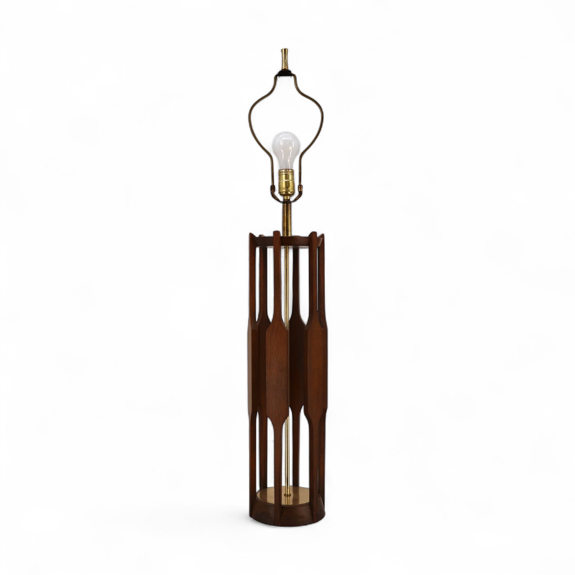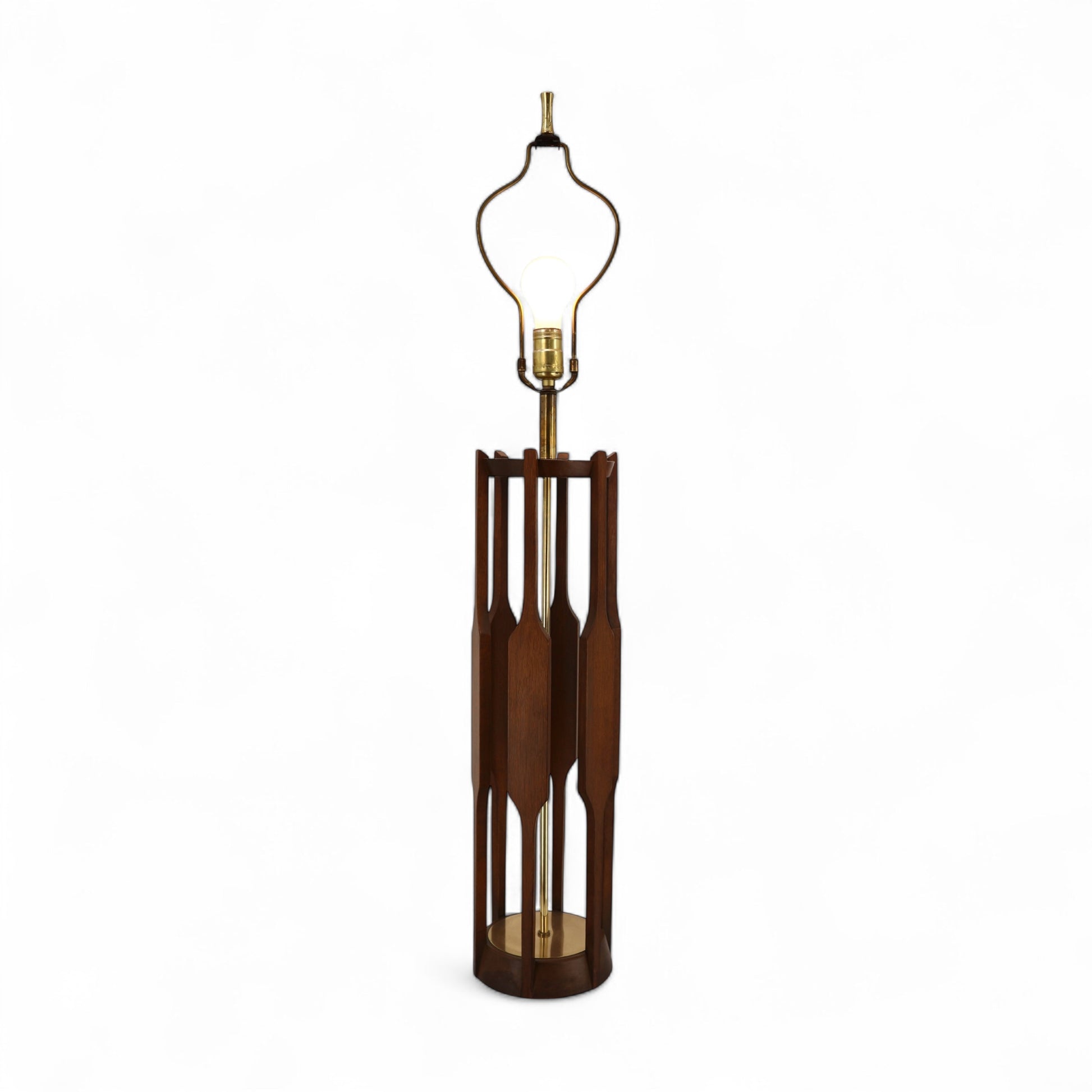 Sculptural and striking, this 1960s Mid Century Modern lamp attributed to Modeline is a bold example of American lighting design. The walnut frame features a dynamic interplay of negative space and tapered vertical elements, creating a lantern-like silhouette that feels both architectural and organic. A central brass column runs through the open framework, offering a warm contrast to the richness of the wood.
