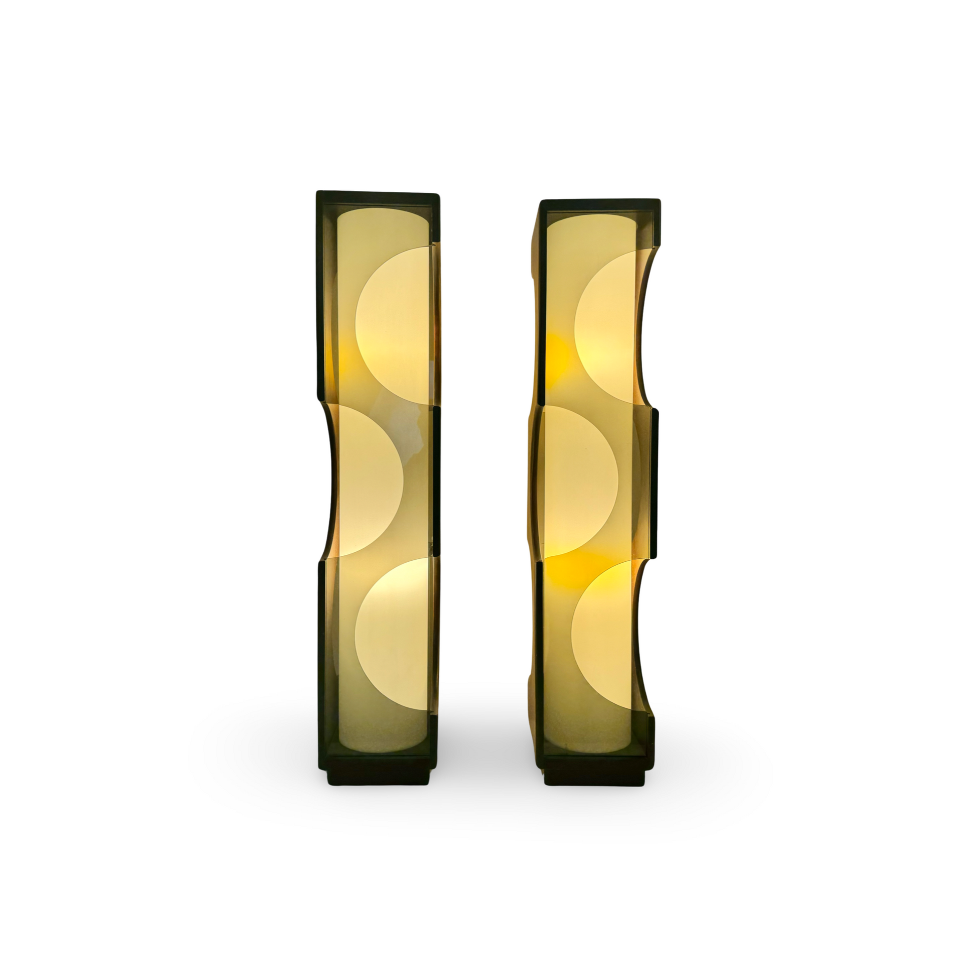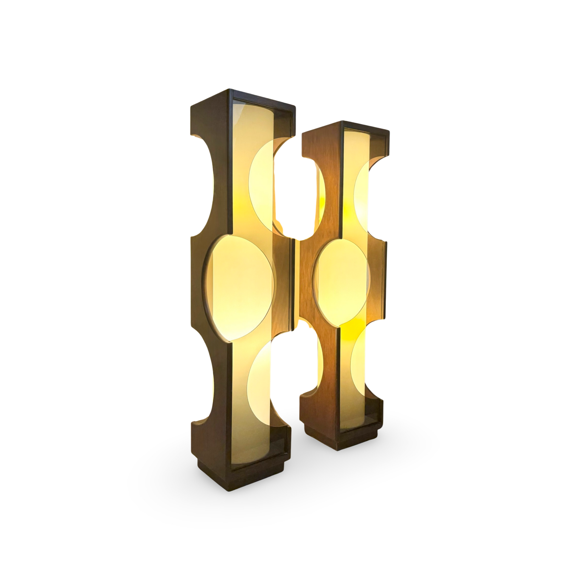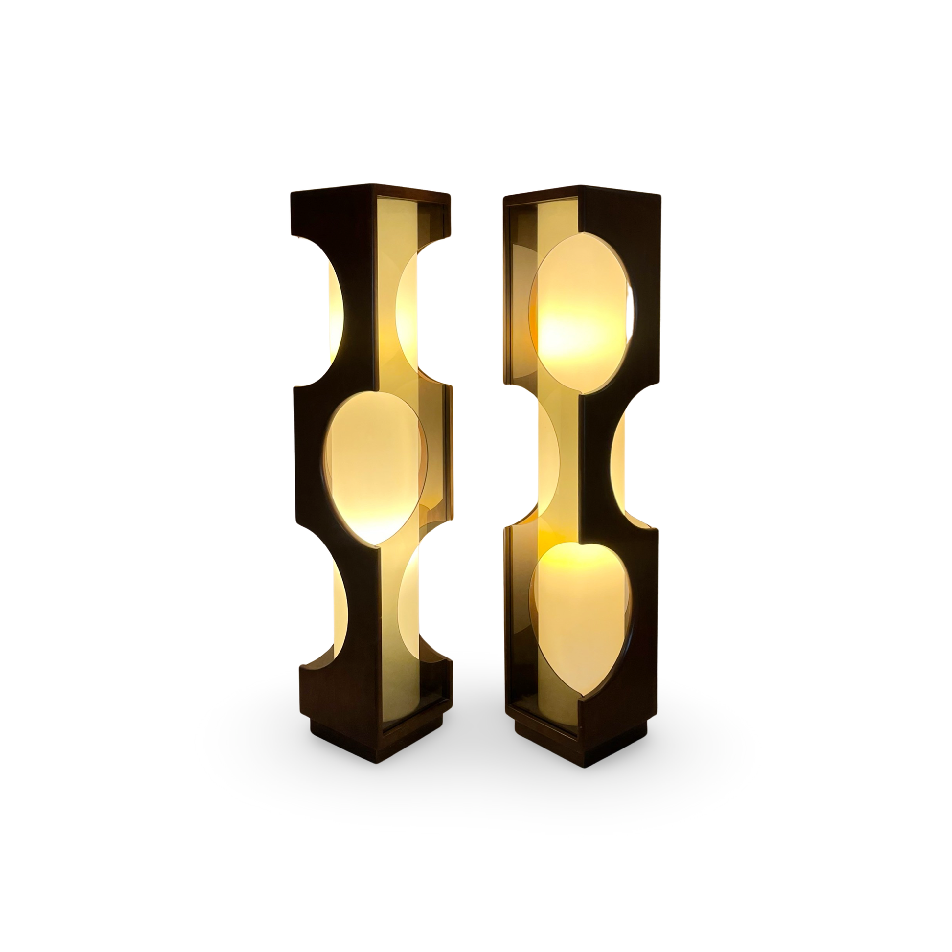 The body of each lamp is thoughtfully designed, incorporating a white cylindrical core that gracefully diffuses light. While this central cylinder reveals a hint of discoloration from the bulbs' warmth over time (can be hidden), it adds character to the piece, speaking to its history and use. The geometric cut-outs in the walnut frame, juxtaposed against the black acrylic, create an interplay of light and shadow that is nothing short of mesmerizing.