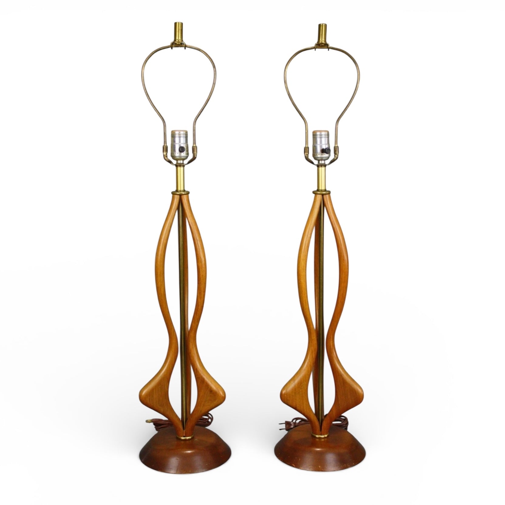 This striking pair of vintage 1960s Mid Century Modern table lamps features sculpted walnut bodies in the classic Modeline style, with flowing, organic curves that create a strong vertical presence and a sense of movement. The carved wood forms wrap gracefully around a central brass column, rising from rounded walnut bases and topped with original brass harp hardware. The warm tone of the walnut and the elegant contrast of brass give these lamps a refined yet sculptural look that works beautifully in both minimalist and richly layered interiors.