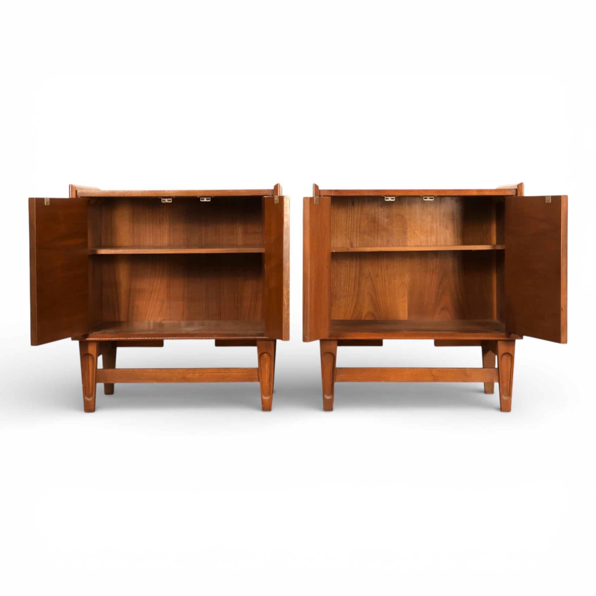 Each nightstand has a pair of hinged cabinet doors that open to a spacious interior fitted with an adjustable shelf, allowing for flexible bedside storage. The proportions are wide rather than deep, giving the pair a low, horizontal stance that works especially well in mid century modern bedrooms. Natural grain variation and subtle tonal shifts are visible throughout, emphasizing the material quality and craftsmanship typical of Specialty Woodcraft designs from the period.