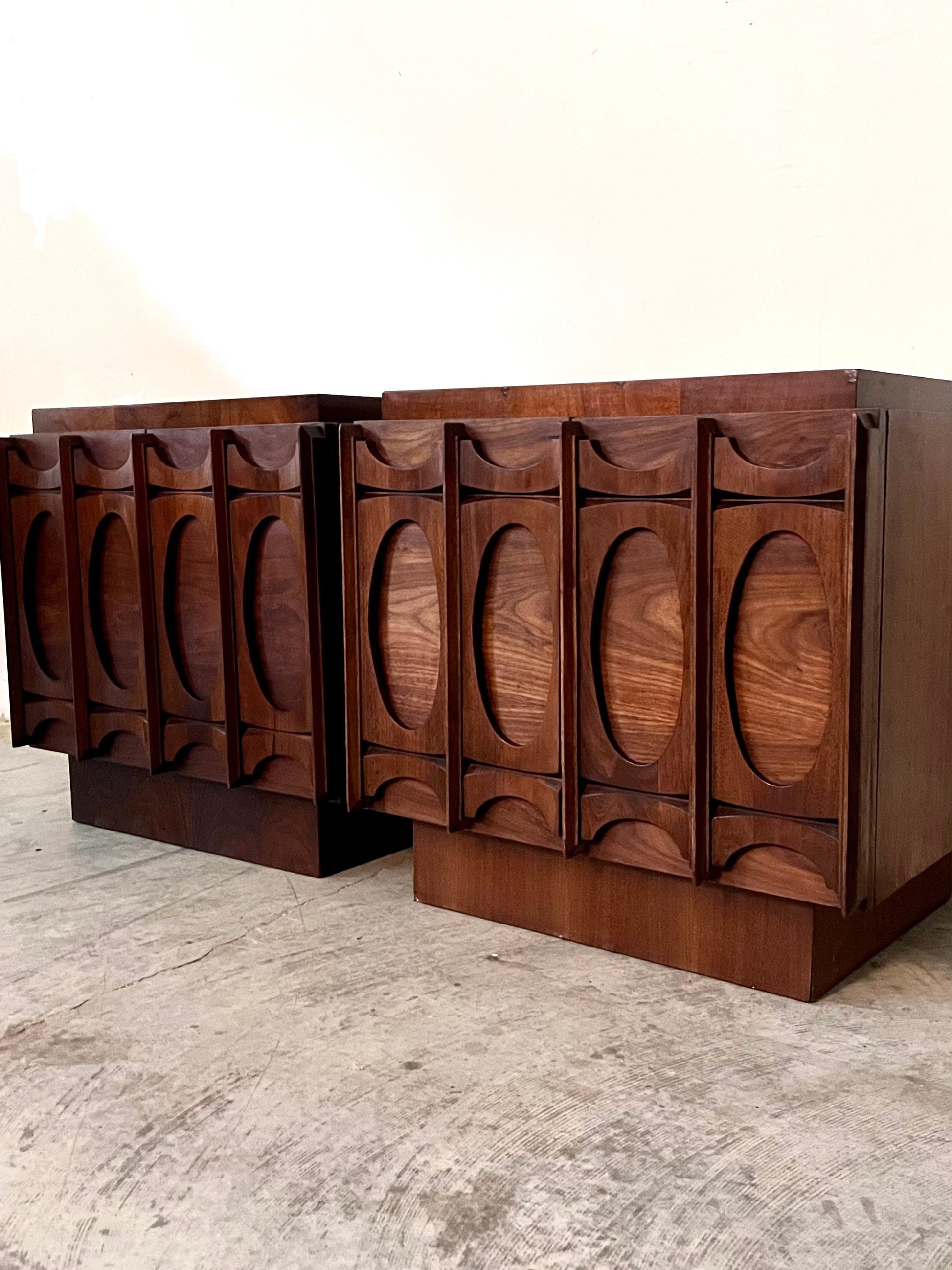 Fantastic pair of nightstands by Tobago Furniture of Canada. Grand proportions, high-quality construction and beautiful materials. Paul Evan’s style brutalist era pattern which adorns the front facades. It’s a timeless mid-century design which offers character to a contemporary space.