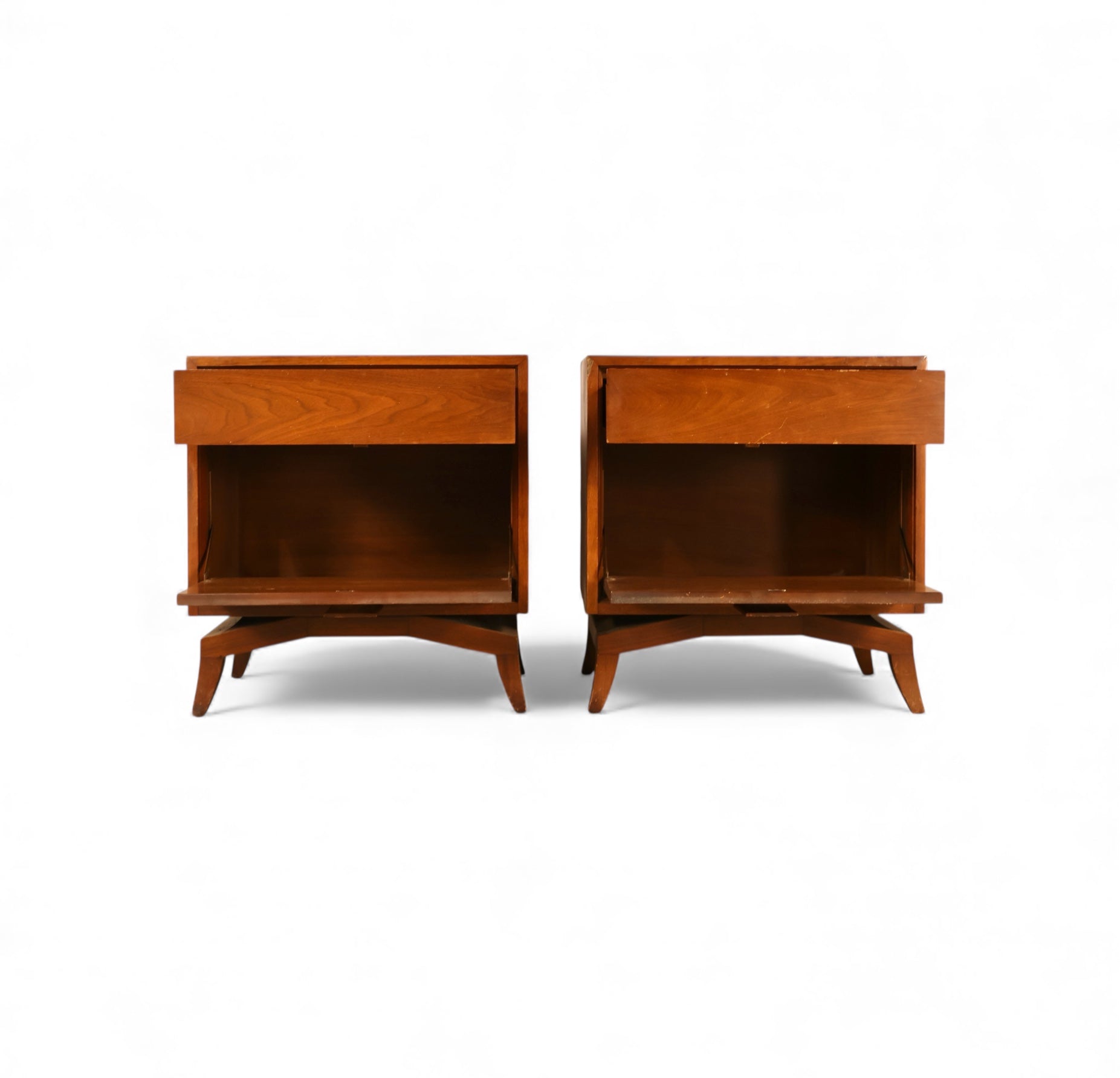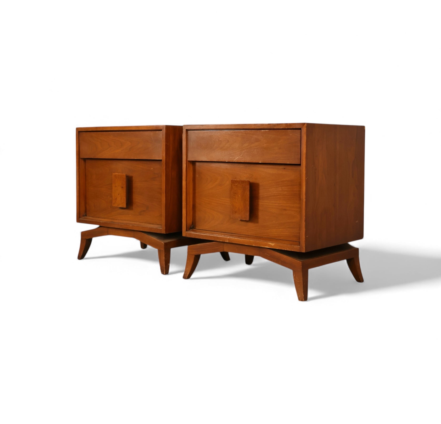 This pair of 1960s Tomlinson nightstands showcases the clean lines and warm materials that defined the brand’s mid-century modern collections. Each nightstand features a walnut case with a rich, even grain, paired with a sculptural base that gives the form a slightly elevated, architectural feel. The lower cabinet doors are accented with rectangular burl wood pulls, adding a subtle touch of texture and craftsmanship to the otherwise streamlined silhouette.