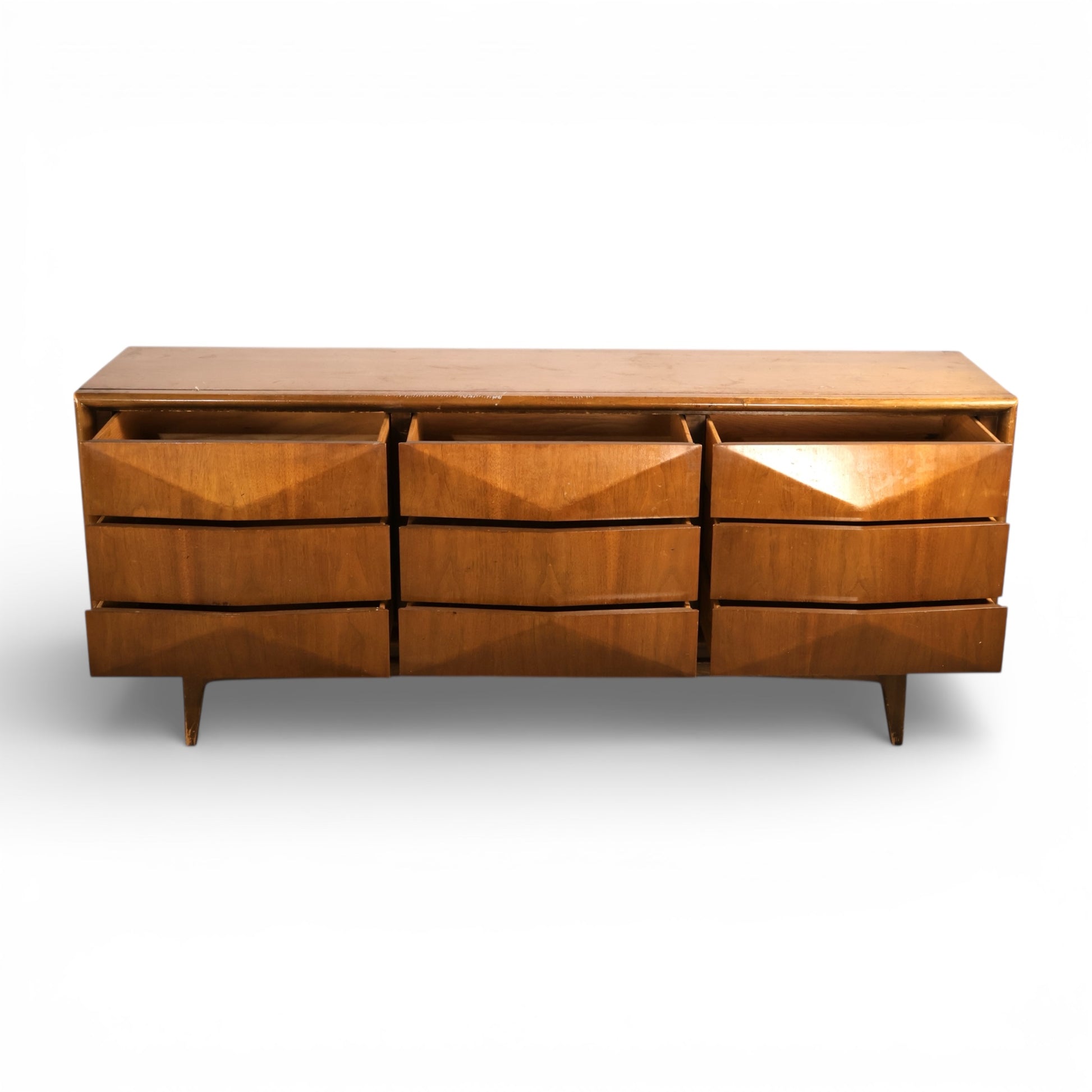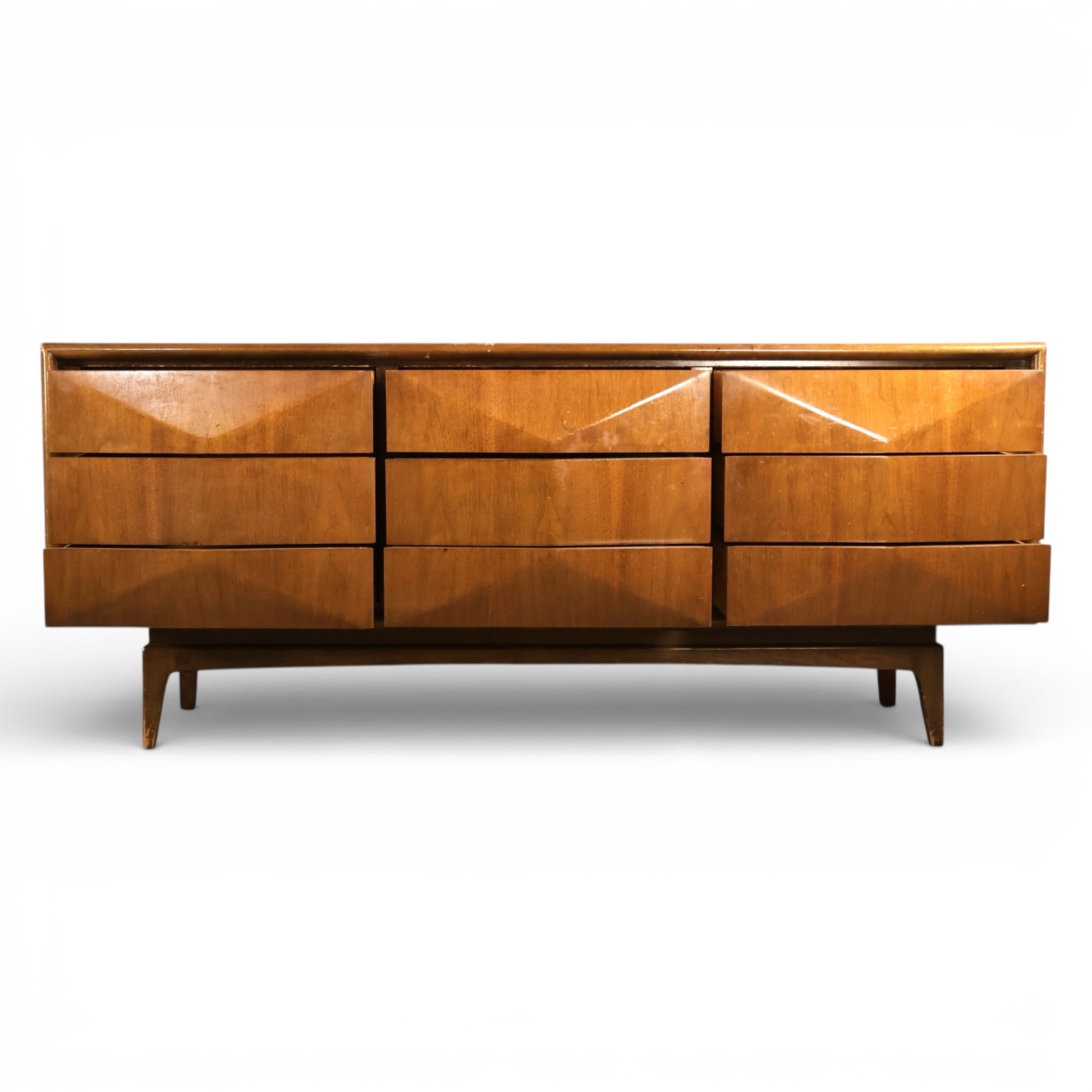 United Furniture Diamond Front Vintage Mid Century Modern 9 Drawer Lowboy Dresser c. 1960s
