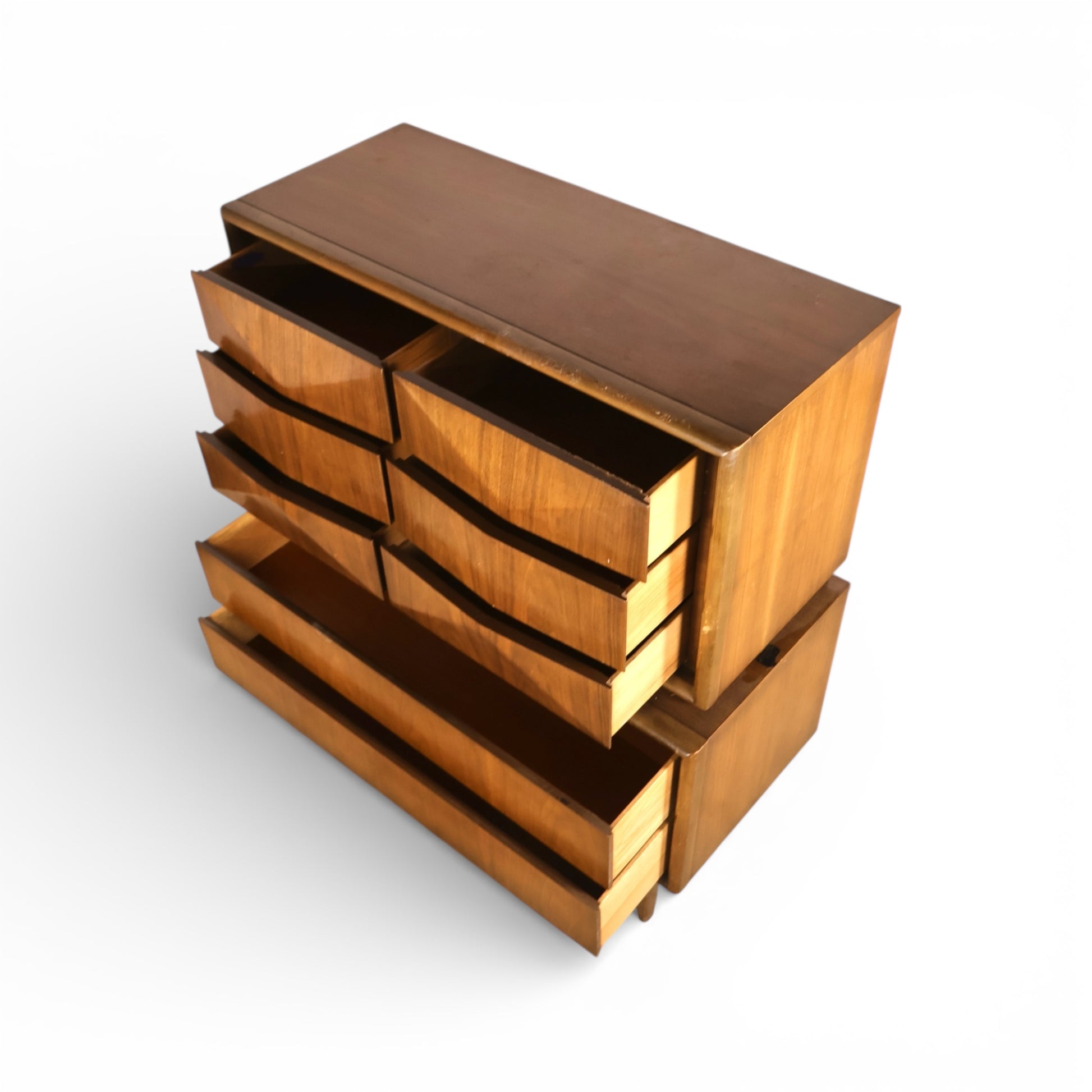 The dresser is constructed in two separate stacked sections, a stepped highboy configuration typical of the period. The upper cabinet contains six drawers arranged in two vertical banks of three, each showcasing the distinctive diamond-front detailing seen throughout the piece. Below, the lower cabinet features two wide, oversized drawers that provide generous storage and anchor the design visually. The drawer layout is both functional and intentional, offering a mix of smaller and larger storage while maintaining a cohesive, sculptural look from every angle.