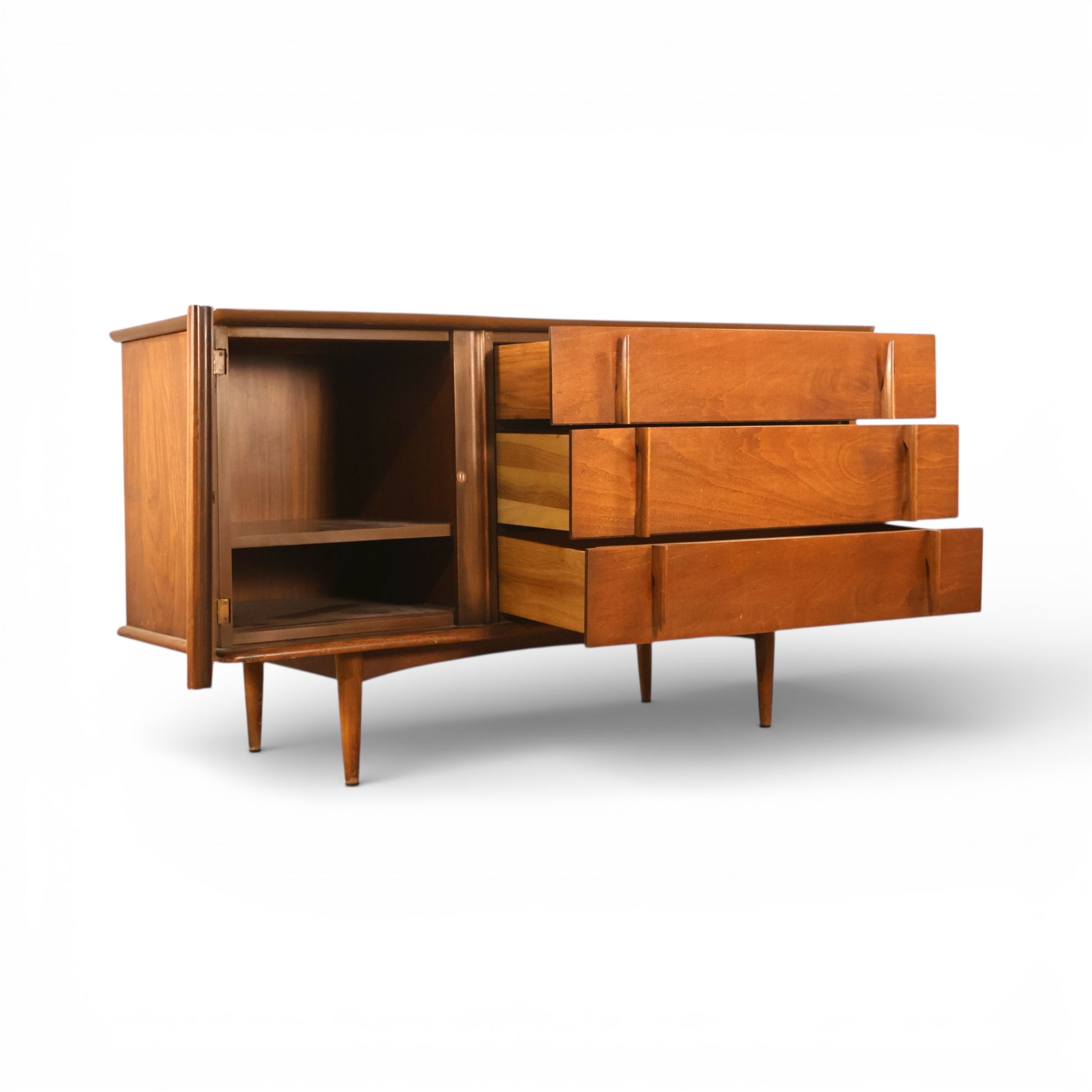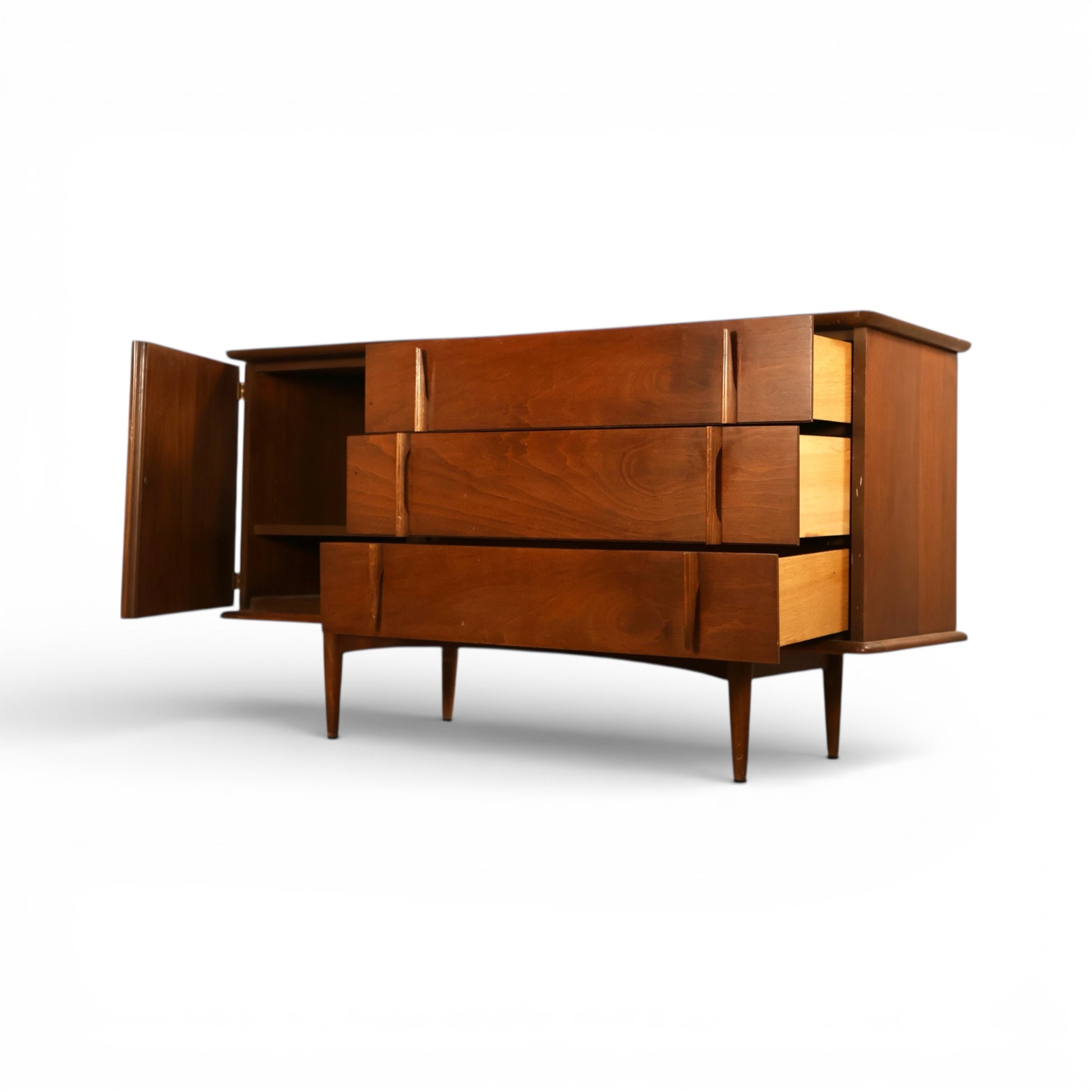 This United Furniture vintage mid century modern buffet credenza from the 1960s features a clean, architectural profile with distinctive sculptural details. The front is defined by a striking combination of fluted cabinet doors and long, recessed drawer pulls, creating depth and visual rhythm across the facade. Warm wood tones and beautifully flowing grain give the credenza a rich, inviting presence while maintaining the restrained elegance characteristic of mid century modern design.
