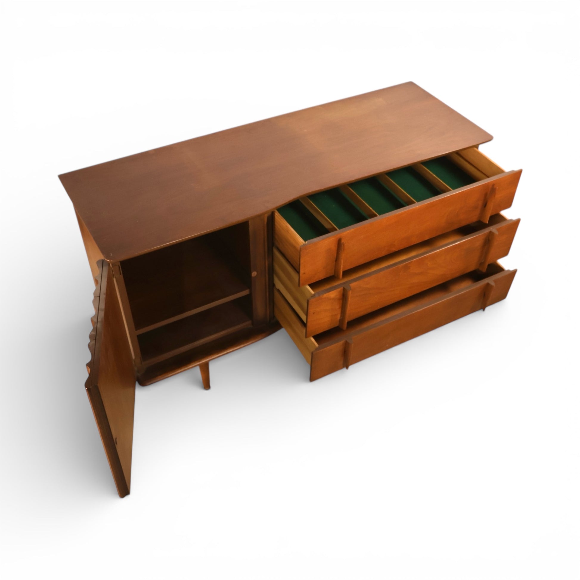 Selecting the restored option includes our full professional refinishing process. Once selected, the piece is transported to our workshop, where we address surface damage like lacquer failure, chips, water marks, and deep scratches. Our team sands, stains, and seals each surface where appropriate, restoring the finish while preserving the character of the original design. We also carefully adjust doors, drawers, and hardware to ensure smooth operation and reliable function. The result is a fully restored vintage furniture piece, ready for daily use and built to last for decades to come.