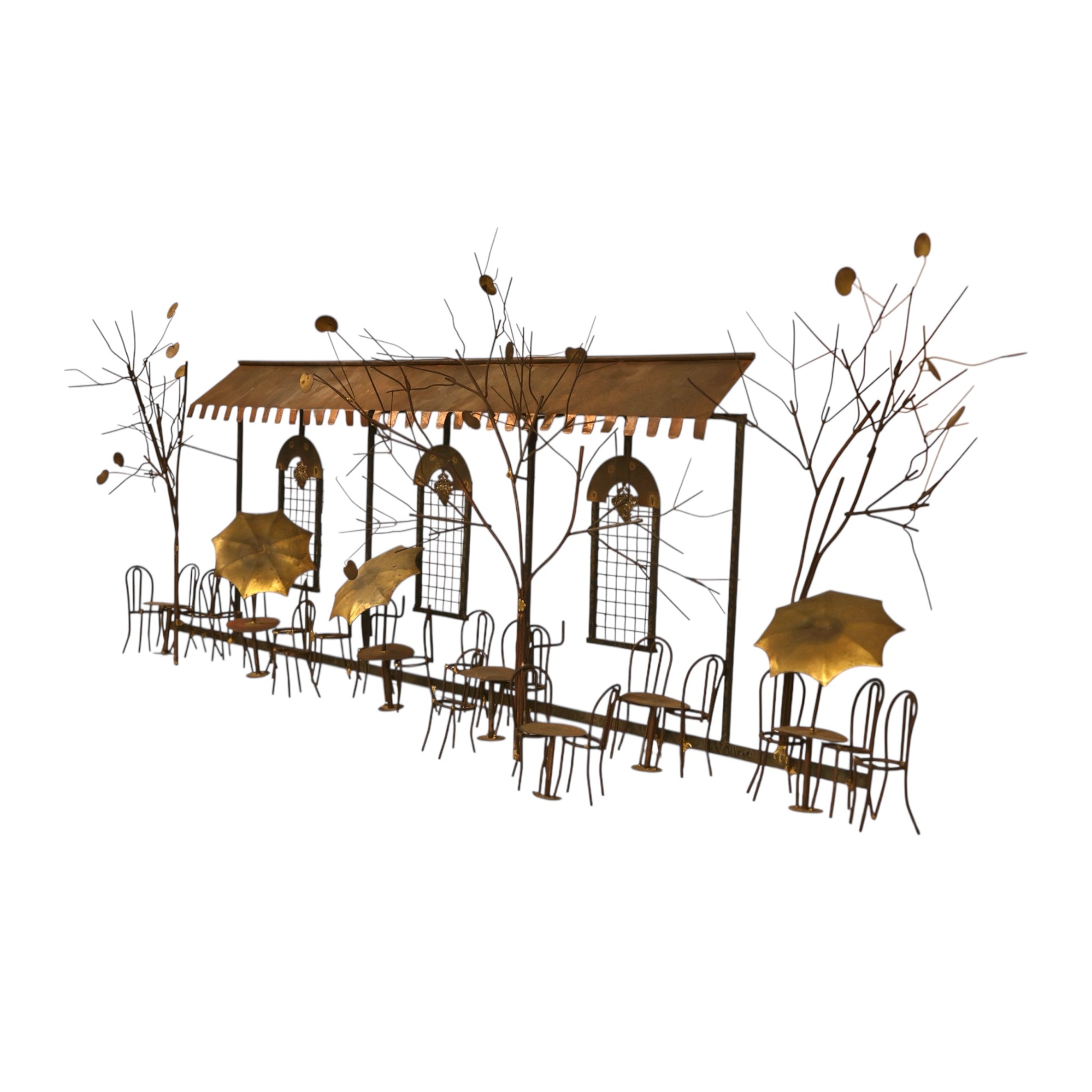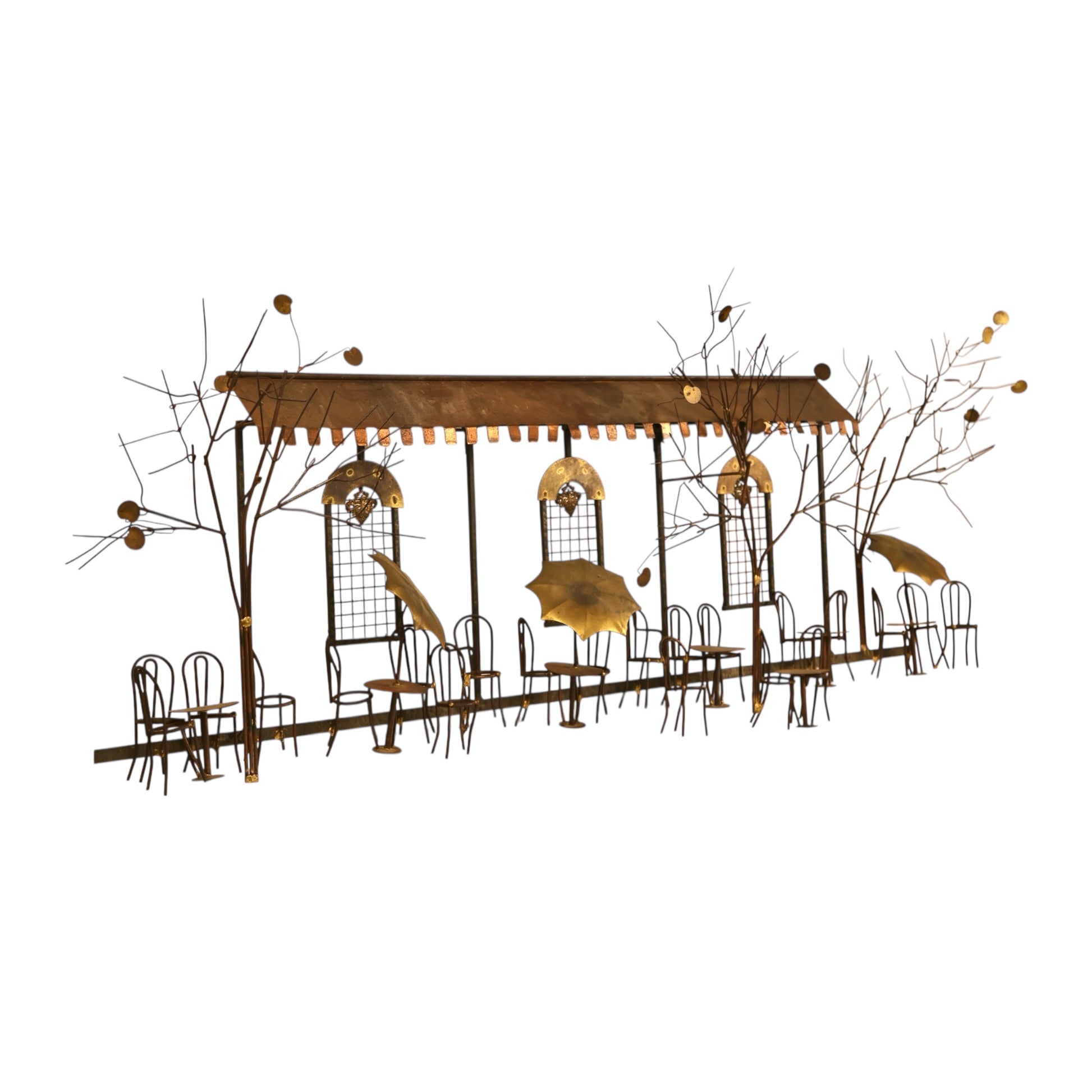 This 1960s vintage mid century modern Curtis Jere brass wall sculpture captures a charming Parisian-style café scene rendered in layered metal with remarkable depth and movement. Delicate wire trees, café tables, bentwood-style chairs, and umbrella forms are arranged beneath an architectural awning, creating a lively streetscape that feels both whimsical and refined. The warm brass tones, hand-cut details, and subtle patina give the piece richness and dimensionality, while the linear composition allows it to span a wall beautifully as a true statement artwork.