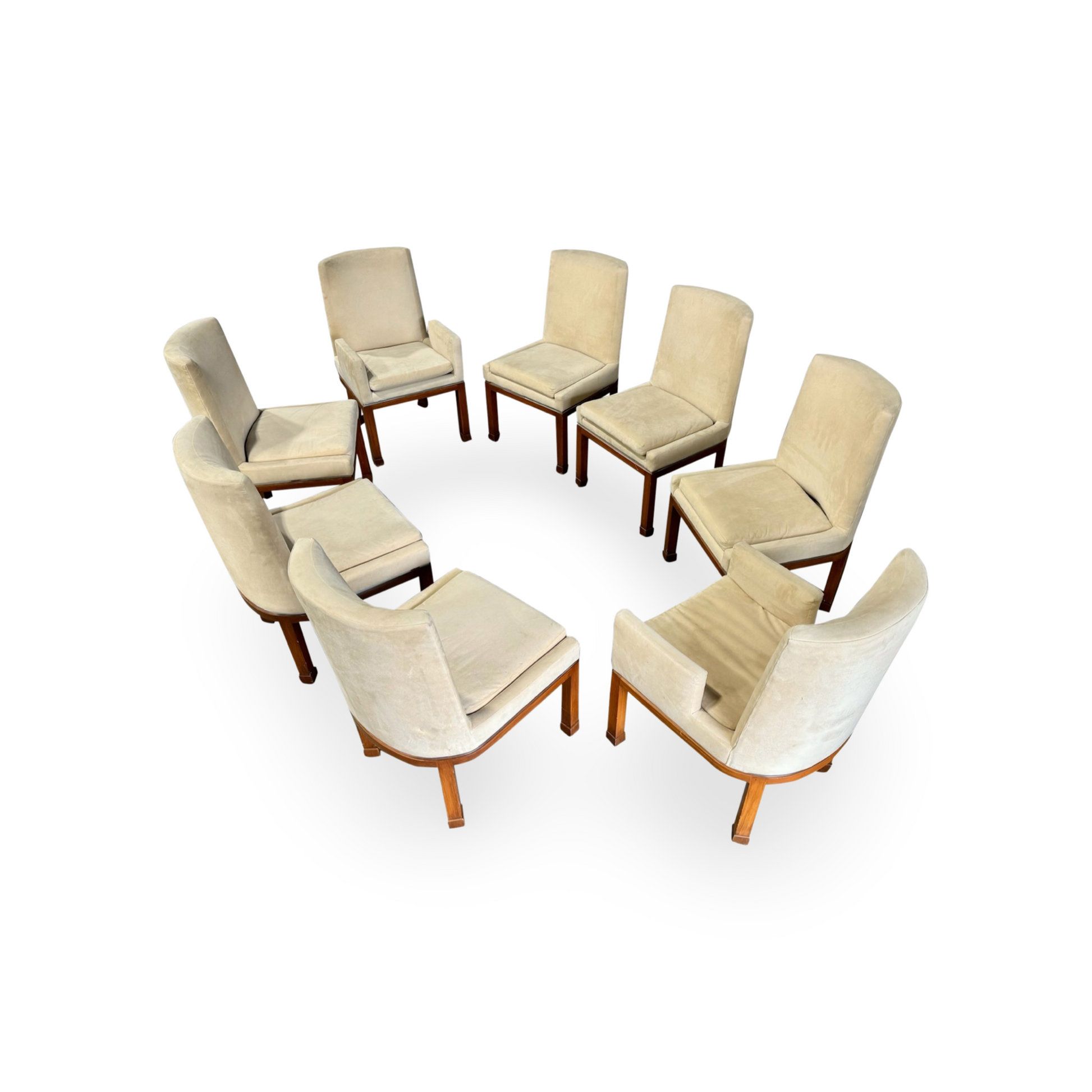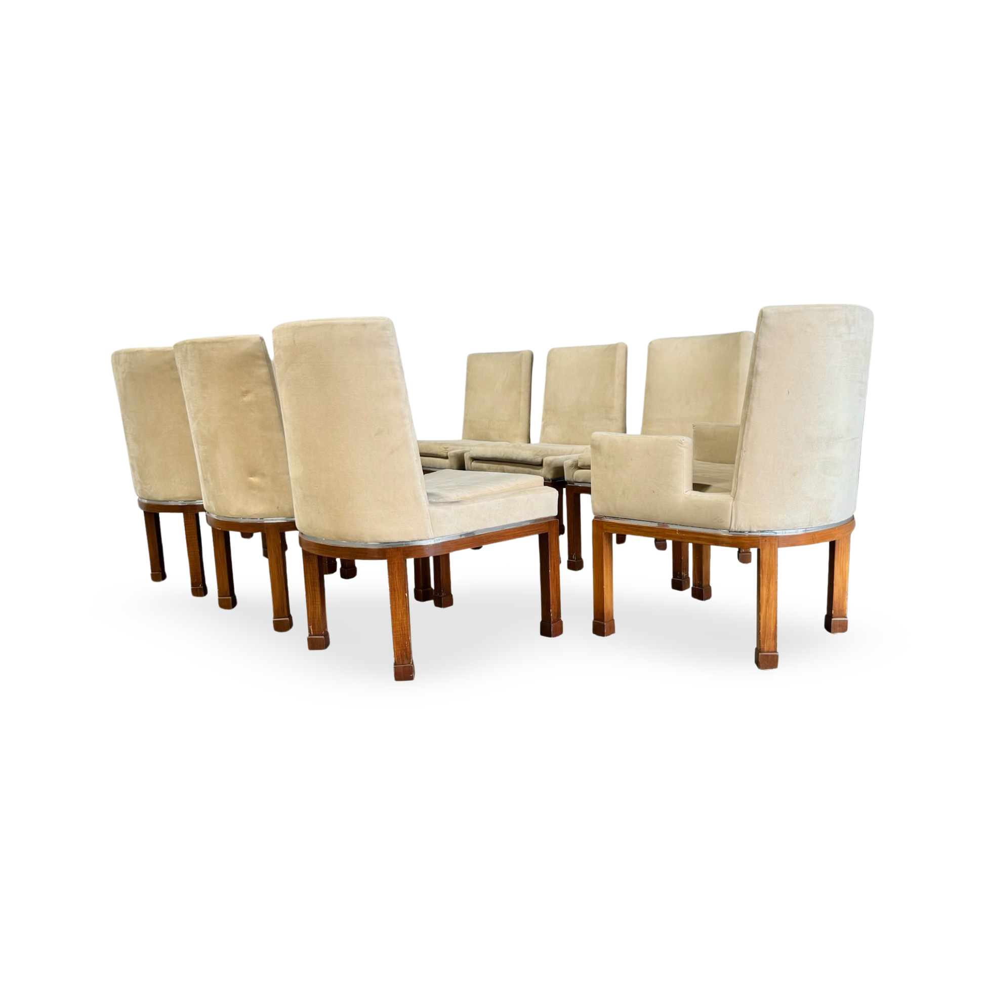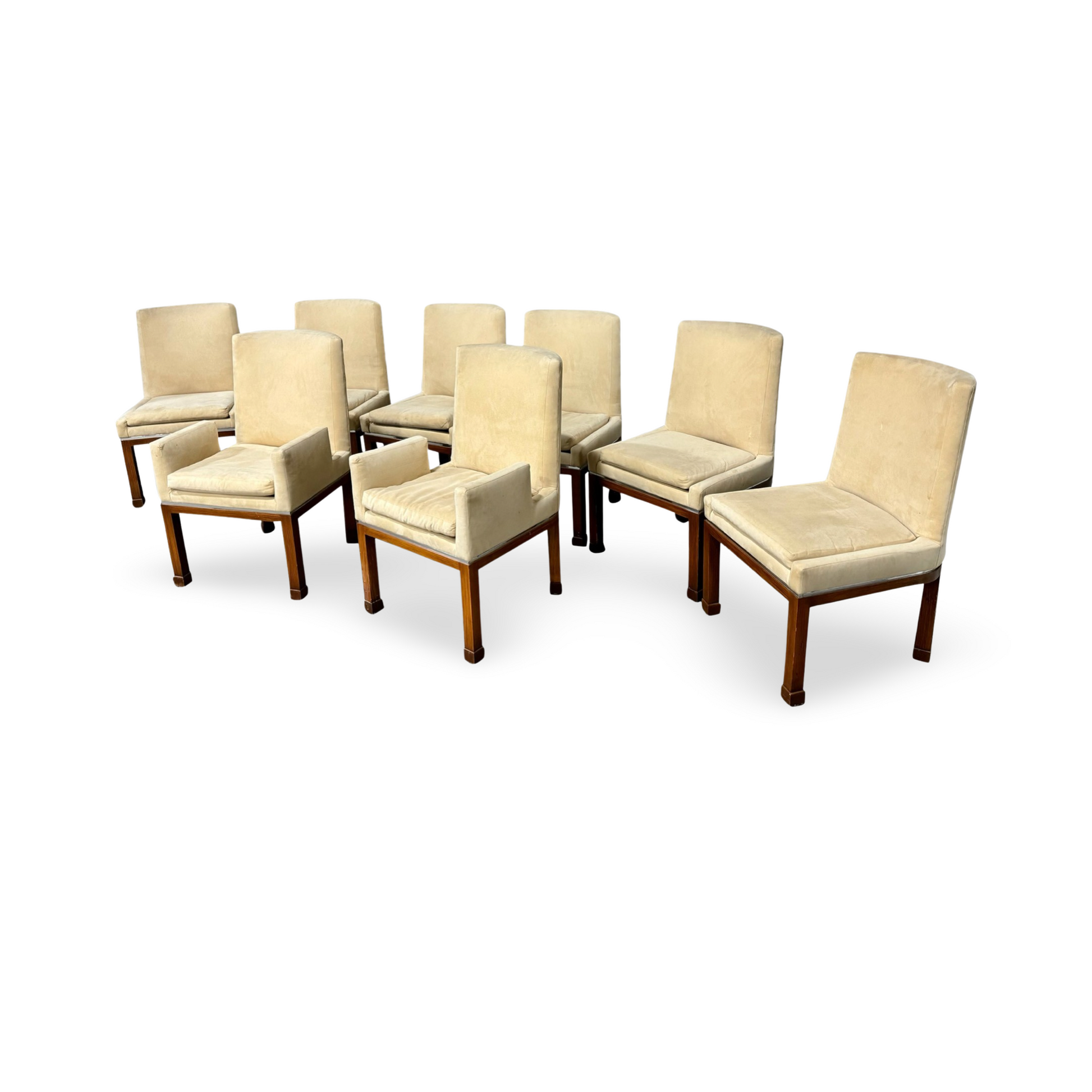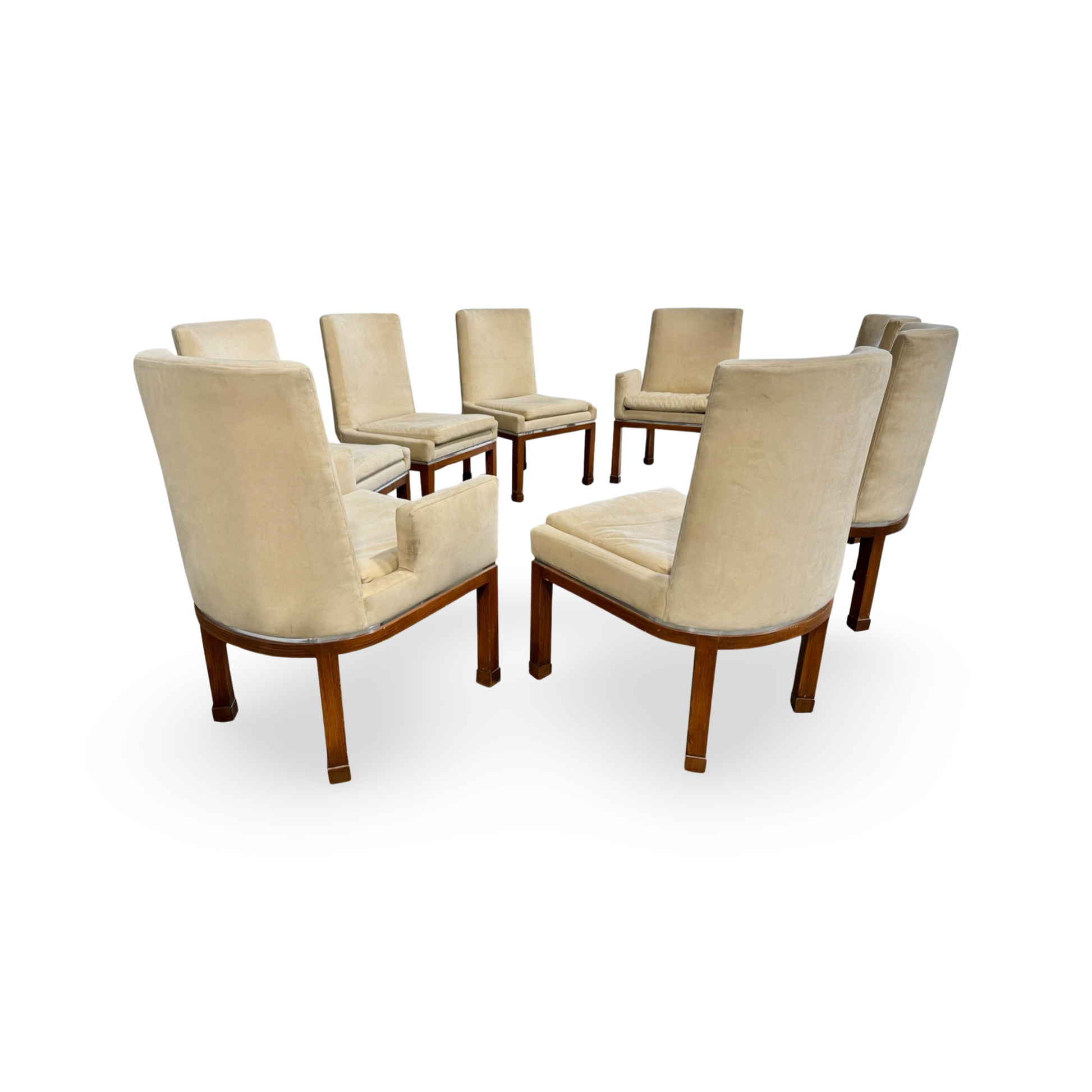 This exquisite ensemble of eight dining chairs, a signature creation by Vladimir Kagan for Vladimir Kagan Designs, includes two artisan-crafted armchairs and six accompanying side chairs.