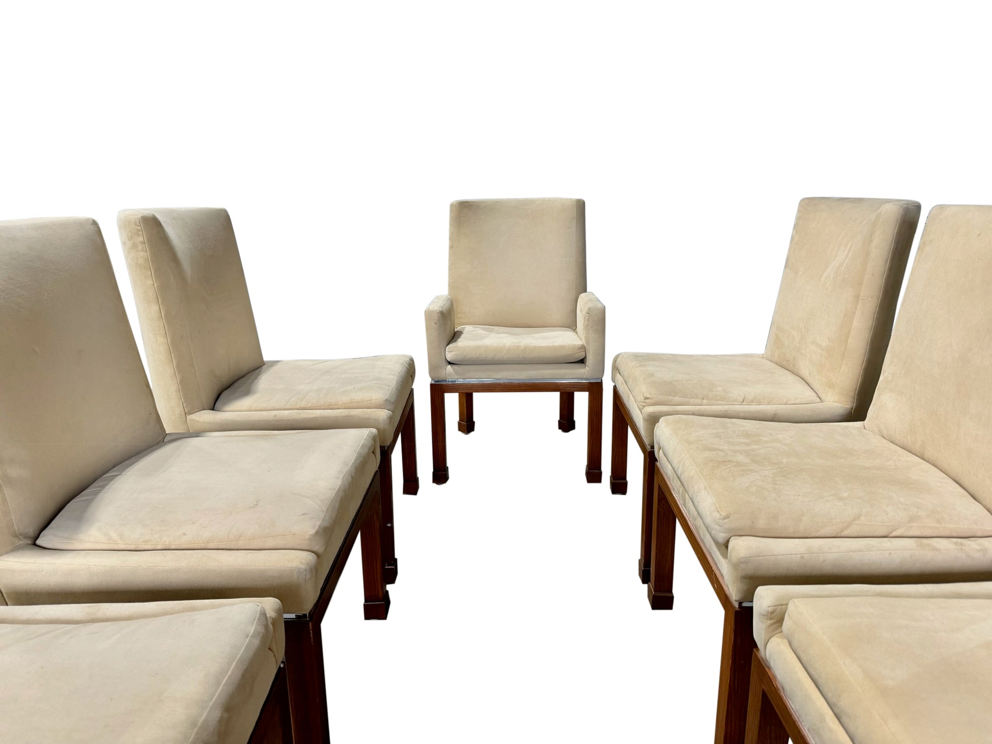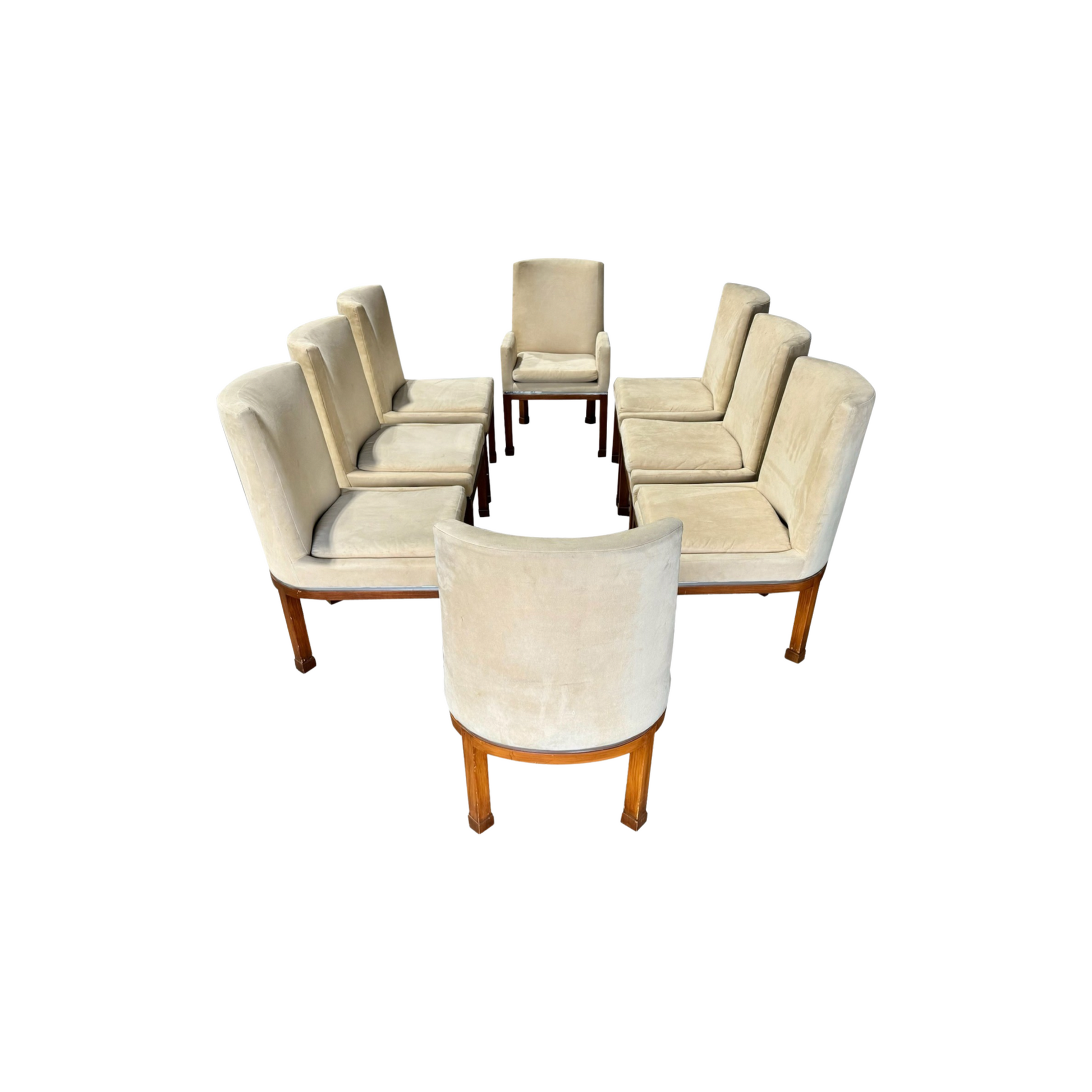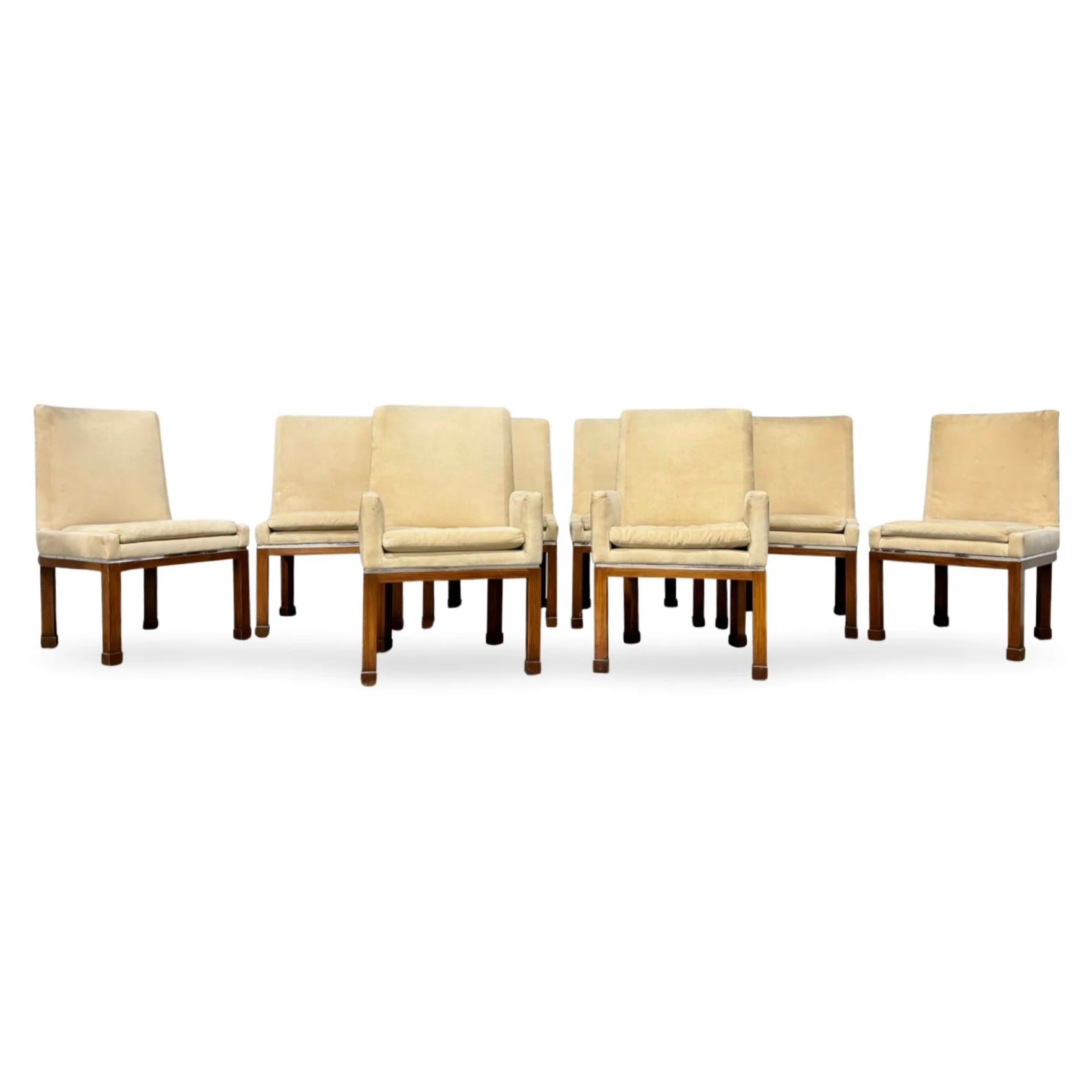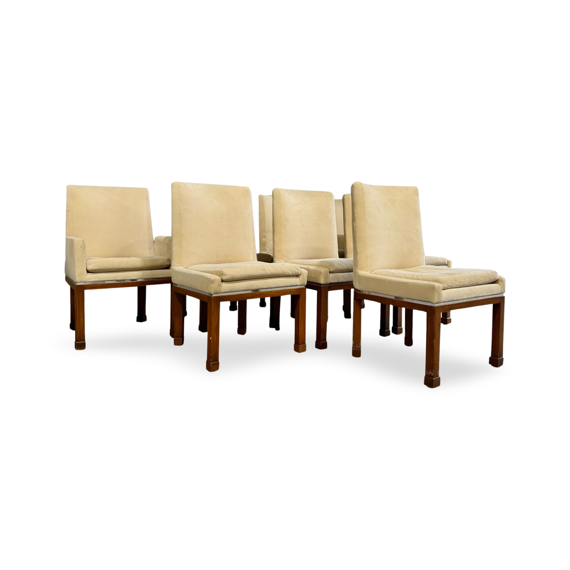 This exquisite ensemble of eight dining chairs, a signature creation by Vladimir Kagan for Vladimir Kagan Designs, includes two artisan-crafted armchairs and six accompanying side chairs.